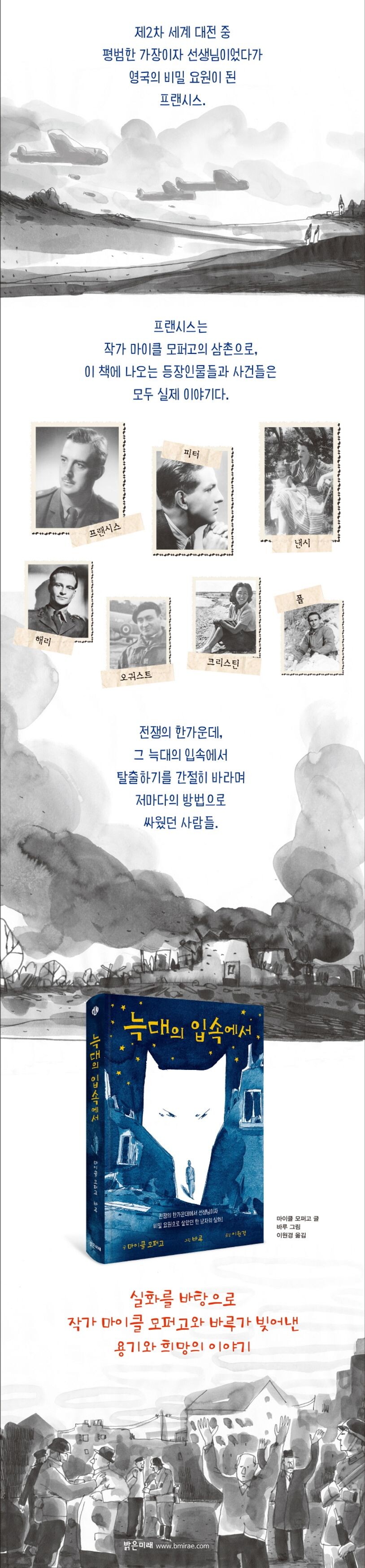 이 책의 주인공 프랜시스는 실존 인물이다. 작가 마이클 모퍼고는 프랜시스의 조카이자 이 책의 저자로서 자신의 삼촌이 전쟁의 한가운데에서 겪은 일을 글로 담담하게 풀어냈다. 책에는 프랜시스뿐만이 아니라 그의 남동생인 피터를 비롯하여 그를 둘러싼 다양한 인물들, 이를테면 프랜시스의 아내였던 낸시, 프랜시스와 같은 비밀 요원이었던 해리, 오귀스트, 폴, 크리스틴 같은 인물들이 등장하는데, 이 모든 사람들이 실존 인물이었고 이 책 속에 그려지는 모든 이야기가 실제로 일어났던 일이라는 점에서 더욱 묵직한 감동을 안겨 준다. 프랜시스는 이 책의 각 장에서 자신의 삶을 거쳐 간 이들 한 명 한 명에게 대화를 건네며 이들 모두가 전쟁 상황에서 무엇을 희생했는지, 얼마나 치열하게 싸웠는지 더할 나위 없이 고요한 어조로 자신에게 소중한 이들 모두를 추억한다.