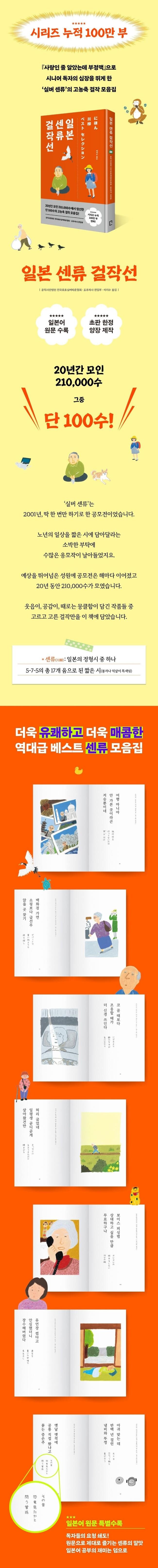 일본에서 시리즈 누적 100만 부를 돌파한 실버 센류 시리즈가 20주년을 맞아 특별판으로 돌아왔다. 기존 시리즈와 달리 이번 책은 20년 동안 쌓인 210,000수의 응모작 중에서 입선작 100수만을 고르고 골라 한 권에 담아낸 “베스트 오브 베스트”다.