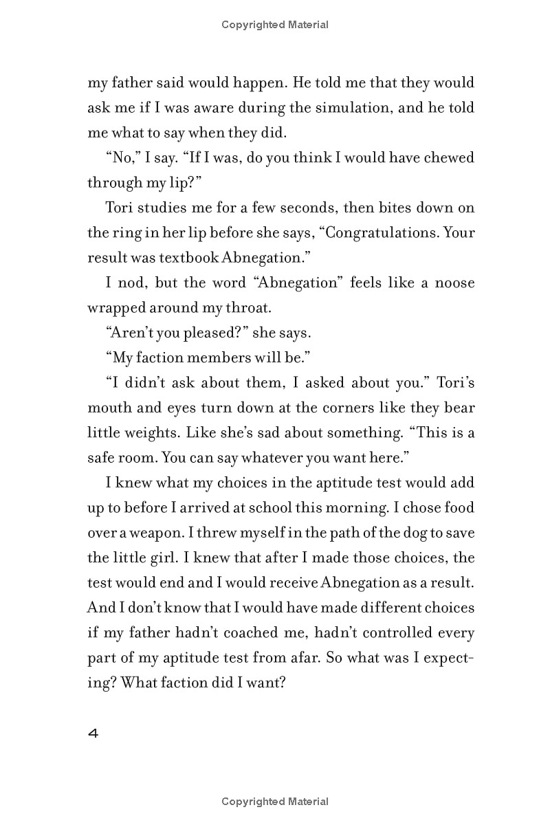 Four는 트리스처럼 ABNEGATION이었다가 DAUNTLESS로 이적한 사람입니다. 2년 전 에브니게이션에서 그 집단의 지도자인 마쿠스의 착한 아들 Tobias로 살던 그에게 어떤 일이 있어났던 것인지 Four의 목소리를 통해 들려줍니다.
