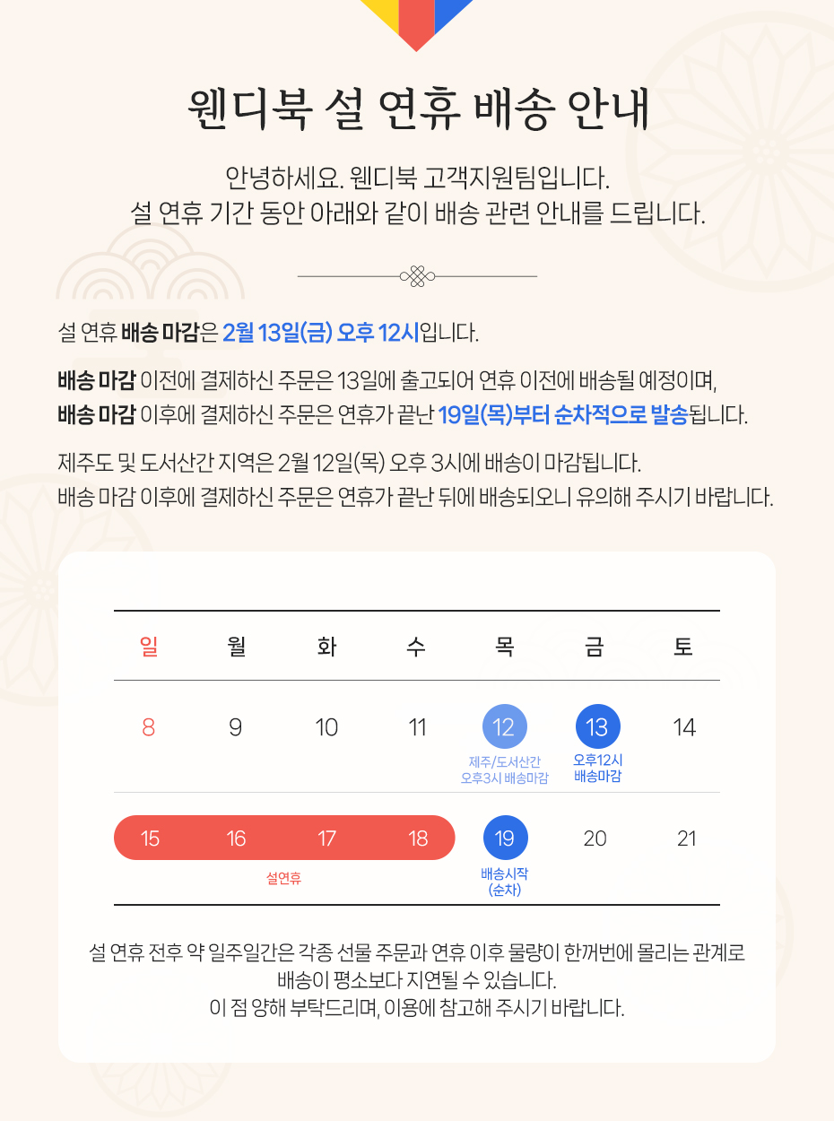 이번 설 연휴 기간 배송 관련해서 안내 드립니다.