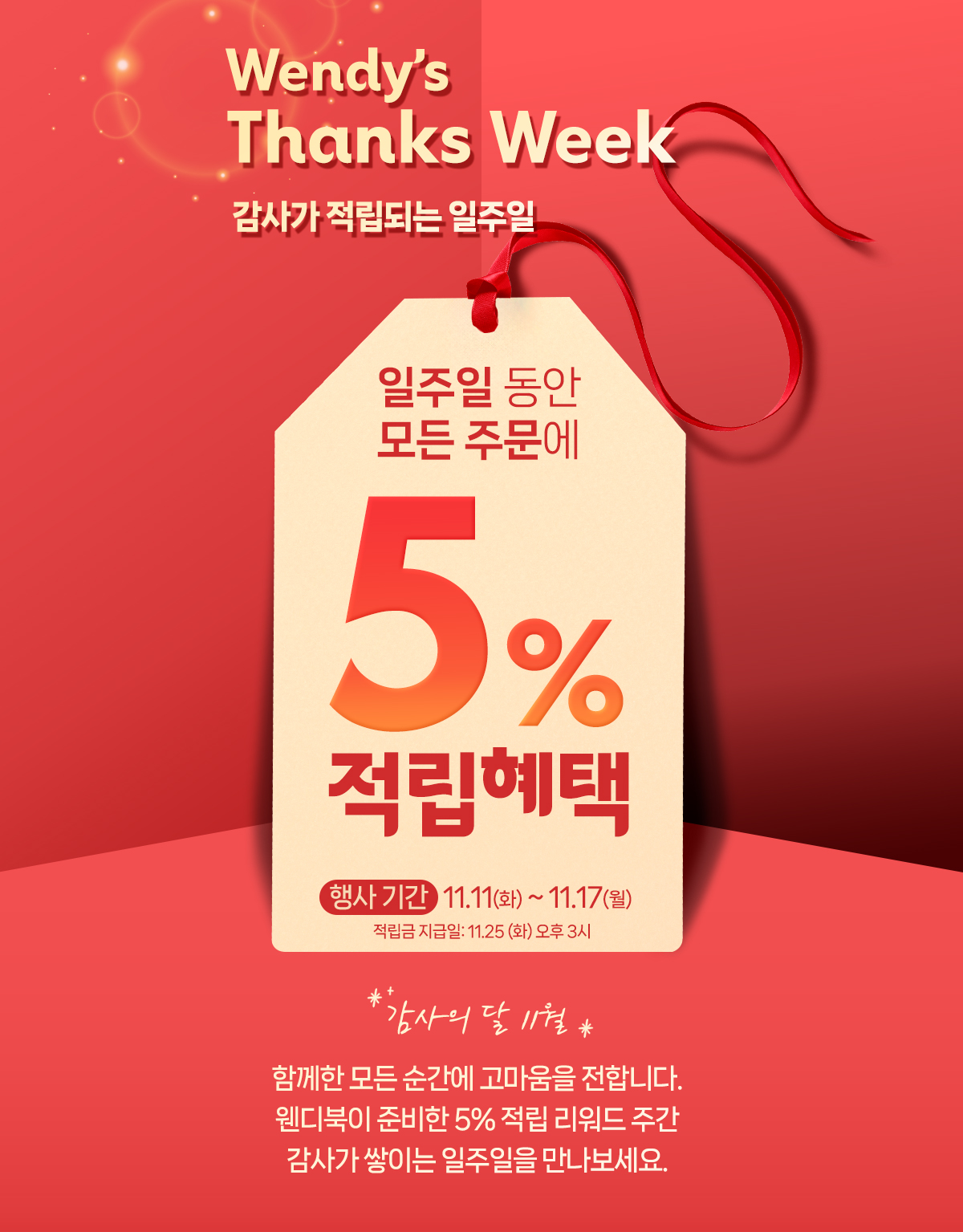 모든 주문 5%적립) Wendy’s Thanks Week 감사가 적립되는 일주일