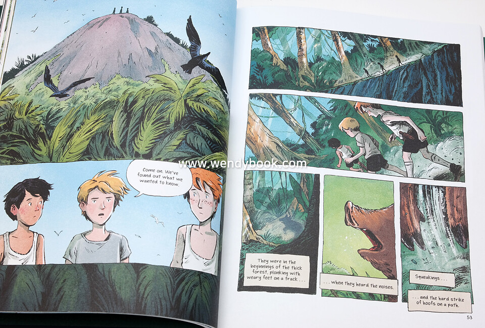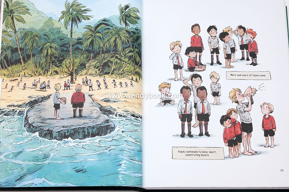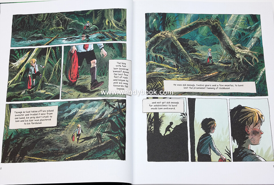 무인도에 표류된 소년들을 통해서 인간의 본성을 그린 불후의 명작<파리대왕>을 그래픽 노블로 옮겼다.