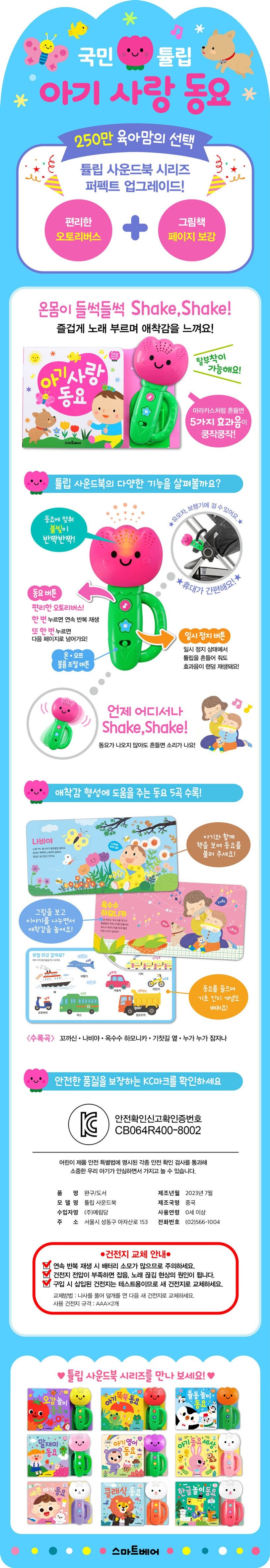 국민 튤립 <아기 사랑 동요>가 새롭게 업그레이드되었어요!250만 육아맘의 선택, 튤립 사운드북 시리즈 <아기 사랑 동요>가 업그레이드되어 출시되었습니다. 영아기에 가장 효과적인 교육 방법은 감각을 자극하는 것입니다. 그중에서도 청각은 가장 먼저 발달되어 태어난 지 2개월 정도면 서로 다른 소리를 구별하지요. 청각 자극은 다른 뇌 활동을 왕성하게 이끌어내는 시발점이 되기 때문에 다른 감각 중에서도 우선적으로 키워 주어야 합니다. <튤립 사운드북> 시리즈는 소리에 민감하게 반응하는 영아들을 위한 사운드북으로, 튤립 마라카스가 책과 분리되어 손으로 꼭 잡고 노랫소리에 맞춰 흔들면 쿵작쿵작 박자를 맞춰 볼 수 있습니다.업그레이드된 <아기 사랑 동요>는 버튼 한 번만 누르면 동요가 연속적으로 반복 재생되는 오토리버스 기능을 추가하여 버튼을 다시 눌러야 하는 번거로움이 없고, 끊김 없이 계속해서 동요를 들려줍니다. 또한 각 동요마다 기초 인지 발달을 돕도록 그림책 활용도를 높였습니다. 수세기, 풀밭에 사는 곤충, 다양한 악기와 탈것 등 동요와 연계된 그림을 보며 낱말 놀이도 즐길 수 있습니다.엄마와 아기의 애착감 형성을 돕는 <아기 사랑 동요>를 불러 주고, 자주 웃고, 꼬옥 안아 주세요. 안정적인 애착감은 아기의 지능 발달, 행동 발달, 사회성에 긍정적인 영향을 미칩니다.<아기 사랑 동요>와 함께 즐겁게 노래 부르며 애착감을 키워 주세요!이 책의 특징➊ 신나게 노래 부르며 애착감을 느껴요!아기들의 애착감 형성에 도움을 주는 동요 5곡이 들어 있어요. 최계락 선생님의 <꼬까신>, 윤석중 선생님의 <옥수수 하모니카>, <기찻길 옆> 등 이 책에 수록된 동요는 아기를 중심으로 사랑에 대해 이야기하고 있습니다. 동요 가사는 QR코드로 제공하여 간편하게 볼 수 있습니다.<수록곡> 꼬까신•나비야•옥수수 하모니카•기찻길 옆•누가 누가 잠자나➋ 동요도 듣고 다양한 활동을 하며 애착감을 키워요!업그레이드된 <아기 사랑 동요>의 본문에는 기초 인지 발달을 도울 수 있는 내용이 추가되었습니다. 동요의 내용과 연계된 수세기, 풀밭에 사는 곤충, 다양한 악기와 탈것 등으로 자연스럽게 인지 능력을 키우고, 아기와 함께 다양한 이야기를 나누며 애착감을 키워 보세요.➌ 오토리버스 적용으로 더욱 편리해졌어요!버튼 하나로 재생과 스킵 기능을 설정해 두어 동요 5곡을 연속으로 들을 수 있고, 듣고 싶은 동요를 찾아서 들을 수도 있습니다. 특히 오토리버스가 새롭게 적용되어 끊김없이 계속해서 동요를 들을 수 있어 편리 합니다. 또한 노랫소리에 맞춰 불빛이 반짝반짝 빛나 더욱 흥겨운 동요 놀이가 가능합니다.➍ 마라카스처럼 흔들면 동요에 맞춰 효과음이 나와요!마라카스처럼 손에 꼭 잡고 신나게 흔들어 보세요. 움직임에 맞춰 5가지 효과음이 쿵작쿵작 흘러나옵니다. 일시정지 상태에서 흔들어 주면 효과음만 재생되어 아기들의 귀를 더욱 즐겁게 해 줍니다.➎ 탈부착이 가능해 언제 어디서나 동요를 들을 수 있어요!손잡이 모양 고리를 이용해 유모차, 보행기, 아기 침대 등에 매달 수 있습니다. 책이 없더라도 언제 어디서나 간편하게 동요를 들을 수 있고, 장거리 여행시 아기들의 재미있는 놀잇감이 됩니다.❻ 어린이 제품 안전검사 KC 인증 마크 획득까다로운 국내 어린이 제품 안전검사를 통과한 제품으로0세 이상의 아기가 안심하고 사용할 수 있습니다.