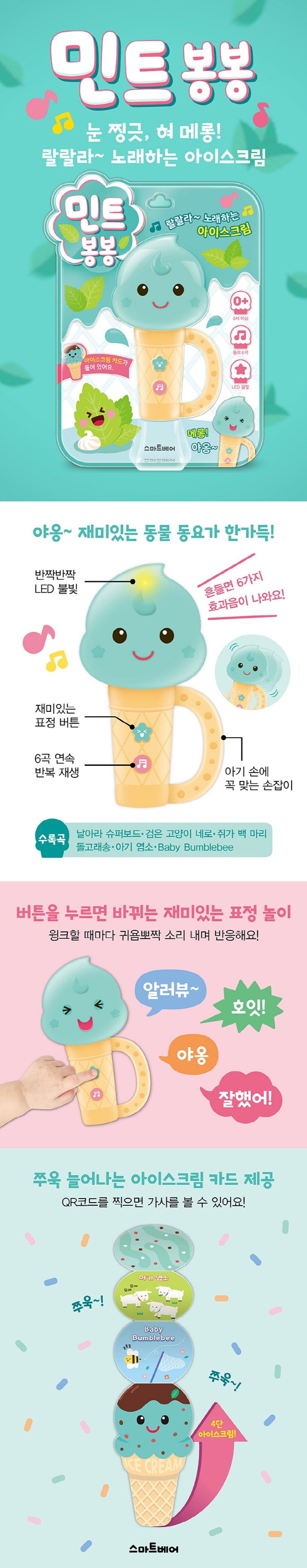 영아기 사운드북은 아기들의 몸과 마음, 두뇌 발달에 큰 역할을 합니다. 음악을 들으며 리듬에 맞춰 몸을 움직이고, 정서적 안정을 취하며 전인적 성장이 이루어지기 때문입니다. 랄랄라 노래하는 아이스크림 <민트 봉봉>으로 우리 아기의 일상에 달콤함을 선물해 주세요!