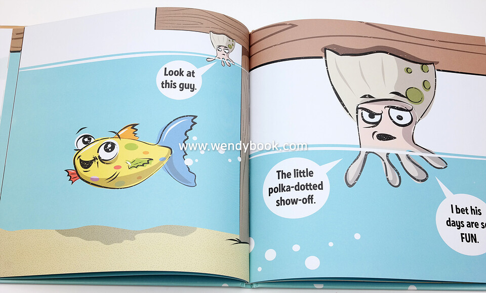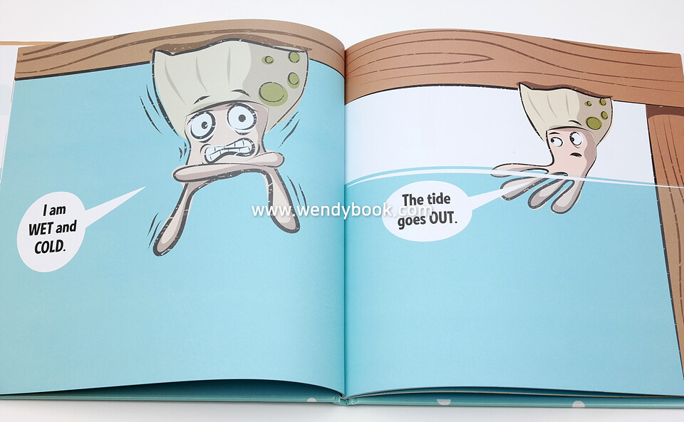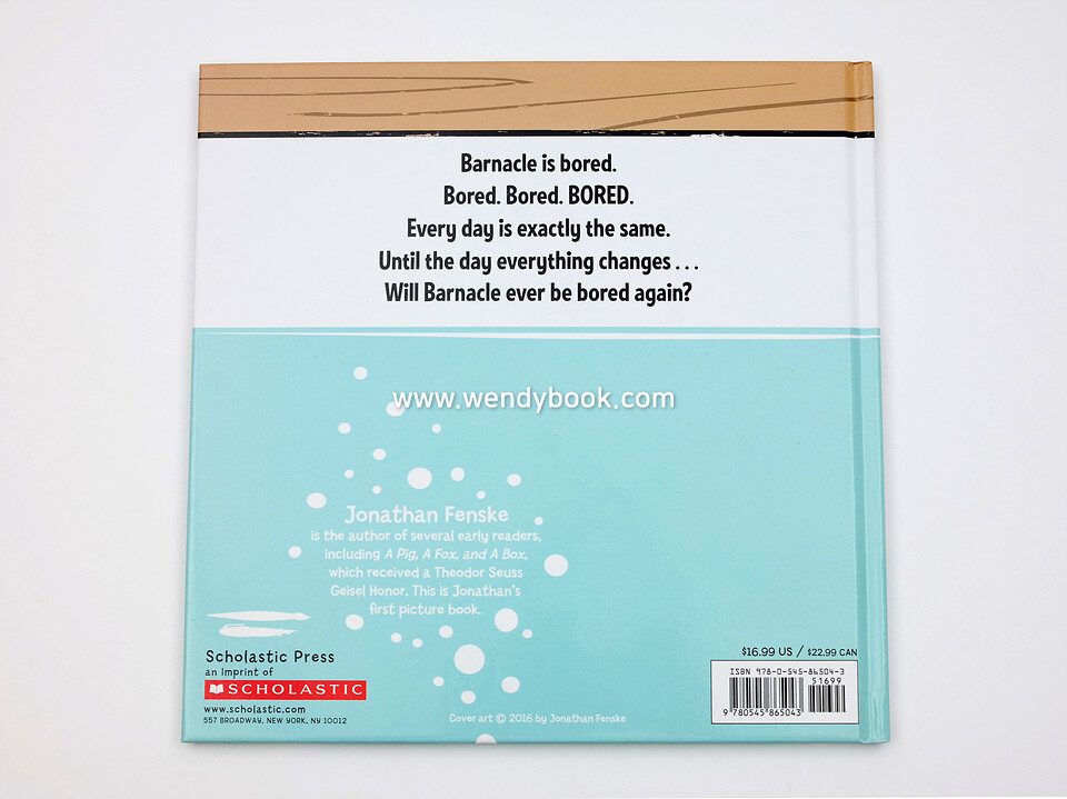 Barnacle is stuck on the underside of a pier, wishing he had something to do. Every day is exactly the same. The tide comes in and Barnacle gets wet. The tide goes out and Barnacle dries off. Boring! Barnacle wants something EXCITING to happen. Then a colorful fish swims by. Barnacle bets the fish doesn't have a boring life. In the end, it turns out exciting isn't always better. . . This picture book is an irreverent and playful answer to any child's declaration of boredom!