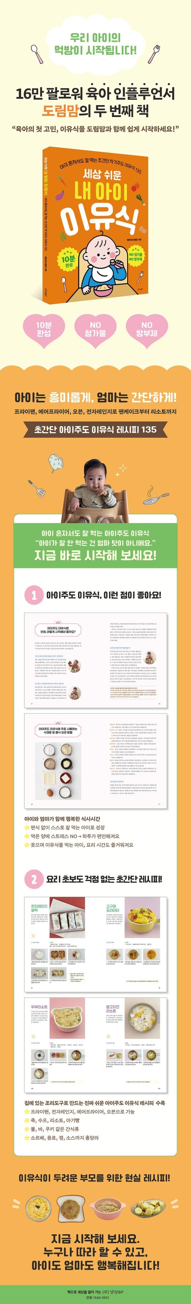 16만 팔로워를 보유한 육아 인플루언서 도림맘의 두 번째 책으로, 최근 육아 시장에서 각광받는 키워드인 아이주도 이유식, 무염·저염 식단, 간편 조리 이유식 레시피를 담았습니다. 모유나 분유 양이 줄어드는 이유식 시기의 아이에게 영양소를 보충하고, 통에 담아 뒀다가 아이가 먹고 싶어 하면 언제든 꺼내어 줄 수 있는 메뉴들입니다.