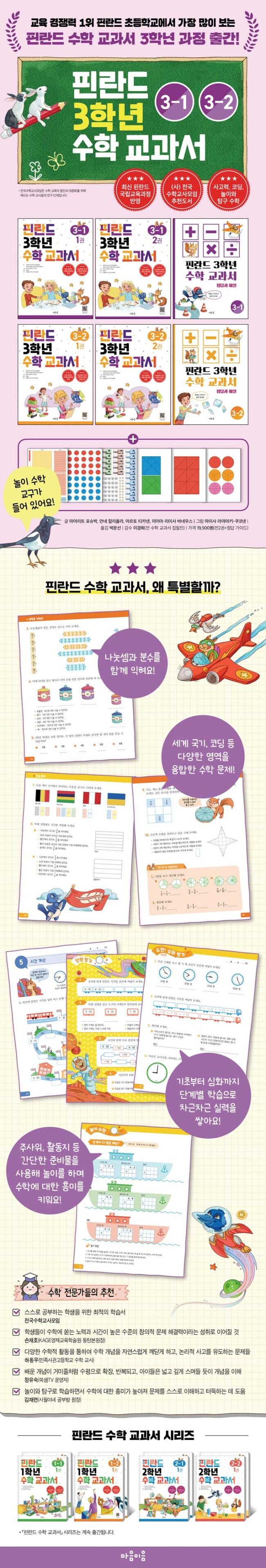 「핀란드 수학 교과서」는 수학 학습에 영감을 불어넣어 줄 풍부한 그림과 연산 실력을 키워 줄 기본 문제를 비롯해 응용, 심화 문제까지 한 권에 모두 담았습니다. 색칠하기, 선 긋기, 수수께끼 풀기, 그림값 구하기 등 재미있는 놀이처럼 수학 문제를 구성하여 수학 흥미도를 높일 뿐 아니라 수학 사고력까지 키울 수 있습니다. 거기에 놀이 수학과 놀이 카드, 탐구 수학, 부모님 가이드도 함께 있어 혼공 시대에 학습 격차를 좁힐 가정 학습용으로 좋습니다.