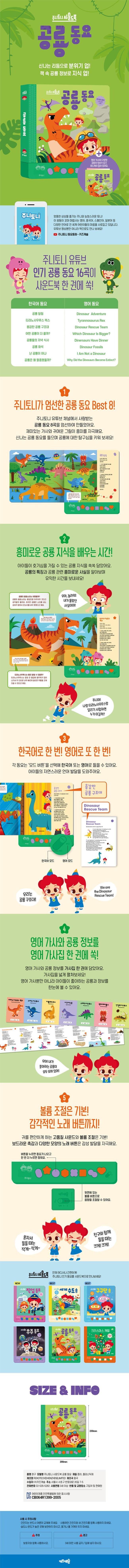 ‘주니토니 사운드북 공룡 동요’에는 영어 가사와 공룡 정보가 담긴 ‘영어 가사집’이 함께 들어 있어요. 특히 영어 가사집 뒷면에는 사운드북에 등장하는 대표적인 공룡이 나열되어 있고, 공룡이 살던 시기와 크기 및 식성 등의 정보를 통해 공룡의 특징을 한눈에 비교해 볼 수 있어요.