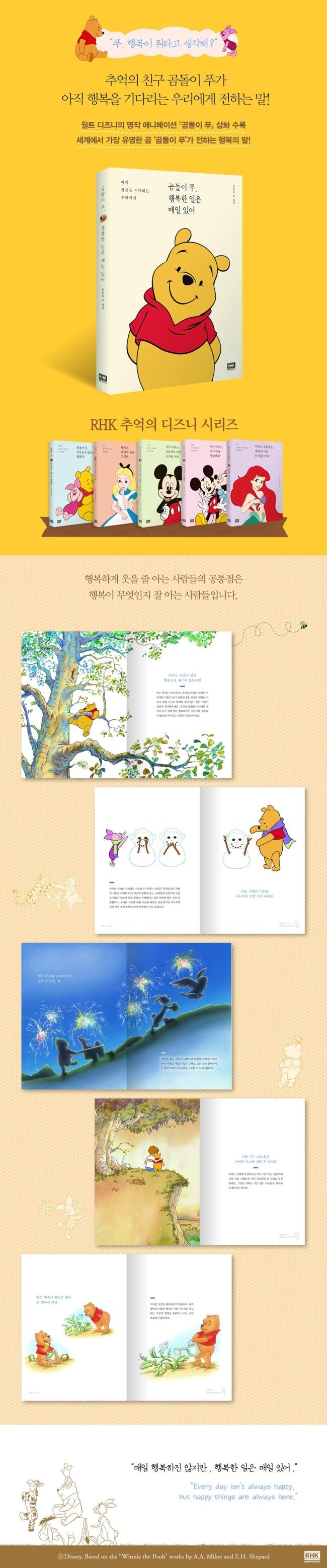 “푸, 행복이 뭐라고 생각해?”그 시절의 우리가 묻고 곰돌이 푸가 답하다.월트 디즈니의 명작 애니메이션 「곰돌이 푸」 삽화 수록!세계에서 가장 유명한 곰 ‘곰돌이 푸’가 전하는 행복의 말!A.A 밀른의 《Winnie the Pooh 위니 더 푸》라는 동명의 동화가 원작인 애니메이션 <곰돌이 푸>는 1977년 월트 디즈니의 스튜디오에서 탄생하여 92년간 전 세계 아이들에게 행복을 전했다. 이후 여러 버전으로 재해석되며 큰 사랑을 받은 <곰돌이 푸>는 1990년대부터 2000년대 초반까지 디즈니 만화동산을 보며 자란 한국 독자들에게는 누구나 사랑할 수밖에 없는 추억의 친구이기도 하다.그 시절의 아이들이 어른이 된 지금에는 곰돌이 푸가 삶에 관한 명대사로 다시금 회자되고 있다. 그 속에는 언뜻 단순하고 두루뭉술해 보이지만 삶의 방식에 관한 확고한(?) 곰돌이 푸만의 룰이 있다.“일단 한숨 자고 시작하자.”“기분이 우울해질 것 같아도 걱정하지 마. 그냥 배가 고픈 걸지도 몰라.”“사람들은 불가능한 것은 없다고 말하지. 하지만 난 매일 아무것도 하지 않아.”이렇듯 푸의 말은 팍팍한 현실과 익숙해진 것만큼 레벨 업된 고된 어른살이에 지친 우리의 마음을 따뜻하고 편안하게 어루만져준다. 이처럼 곰돌이 푸를 기억하고 그리워하는 독자들을 위한 책이 출간되었다. 『곰돌이 푸, 행복한 일은 매일 있어』는 푸의 메시지와 삽화가 담긴 책이다.어떤 상황에서든 여유와 미소를 잊지 않는 곰돌이 푸를 다시 기억하고 만나는 일은, 반복되는 삶 속에서 무엇이 나를 행복하게 하는지를 잊어가는 우리에게, 다시 한번 행복에 관한 희망과 의미를 되새기게 해줄 것이다. 귀엽고 사랑스러운 모습부터 엉뚱한 모습까지 우리를 자꾸만 웃음 짓게 만드는 푸를, 진심 어린 말로 우리의 마음을 자꾸만 무장 해제시키는 푸를, 초기 삽화부터 우리에게 익숙한 만화영화 속 곰돌이 푸의 모습을 퀄리티 높은 디즈니의 삽화로 소장할 수 있는 것도 큰 즐거움이다.나를 지키기 위해 자꾸만 나를 잃어가는 세상 속에서,나로 살기 위한 곰돌이 푸의 마음을 들여다보는 말.“푸는 말이야,머리는 별로 좋지 않지만 절대 나쁜 일은 하지 않아!바보 같은 짓을 해도 푸가 하면 잘 돼.”이 책 『곰돌이 푸, 행복한 일은 매일 있어』는 곰돌이 푸의 긍정적인 기운과 ‘나의 삶은 나의 방식으로 정한다’라고 말했던 독일의 철학자 니체의 말 중에서 오늘날의 우리에게도 도움이 될 만한 조언들을 모았다. 말하자면 곰돌이 푸의 입으로 전하고 니체가 거드는 셈이다. 행복은 여전히 먼 곳에 있고, 나는 어떤 사람인지, 나는 무엇을 할 때 행복했는지에 대한 기억도 점차 흐려져 오늘도 ‘행복’을 찾는 일이 영 요원하게 느껴질 때, 이 책을 펼치면 어떤 페이지를 열든 푸가 느긋한 미소를 지으며 ‘너무 걱정하지 마. 다 잘 될 거야’라고 말하며 우리를 위로해줄 것이다. 어린 시절 우리의 마음을 행복으로 물들여주었던 작지만 사랑스러운 그 모습 그대로!멋지지 않으면 어떤가요? 눈앞의 행복을 꽉 잡으세요.행복이 눈앞에 있는데도 나의 대외적인 이미지 때문에 외면하고 있나요? 혹은 눈앞의 행복이 생각했던 것처럼 근사하지 않아서 머뭇거리게 되나요? 멋지지 않아도 됩니다. 다른 사람의 시선은 그리 중요한 게 아니에요. (...) 어떻게든 찾아온 행복을 꽉 움켜쥐세요!_본문 중에서이렇듯 이 책은 행복한 기억으로 남아 있는 곰돌이 푸의 추억을 다시 불러온다. 그래서 푸를 기억하고 있는 사람이라면 누구라도, 단순하지만 편안하게 스며들어오는 푸의 이야기 속에서 오늘을 살아가기 위한 용기를 얻어갈 수 있을 것이다.