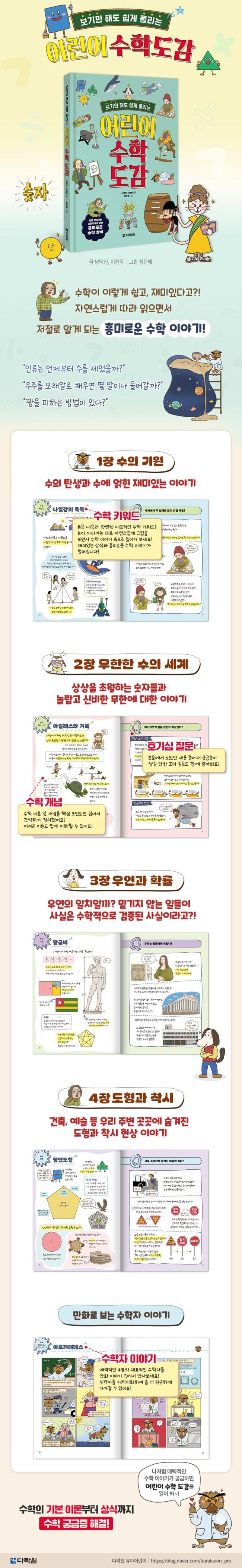 『어린이 수학 도감』에서는 수학의 기본 이론은 물론 수학과 관련된 상식도 함께 기억할 수 있도록 재미있게 소개하였습니다.