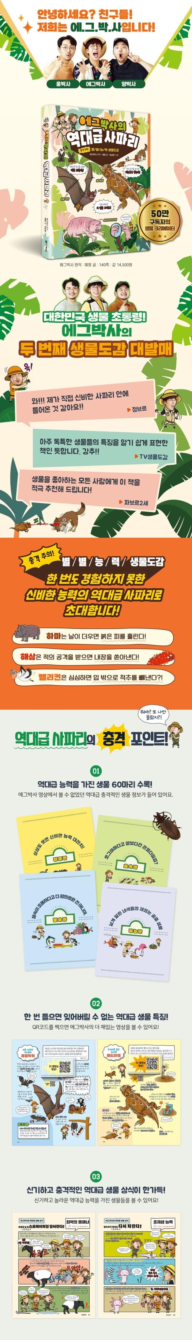 와!!! 『에그박사님의 역대급 사파리』 책 읽어 보니 제가 직접 신비한 사파리 안에 들어온 것 같아요!! 정말 다양한 동물들과 곤충, 바다생물과 새까지도 볼 수 있고 교육적으로도 정보가 아~주 많아서 너무 좋은 것 같아요!! 개인적으로 홀로틀이랑 투구게 좋아하는데~~최고!! 최고!! 이야~ 정말 다 있네요~?