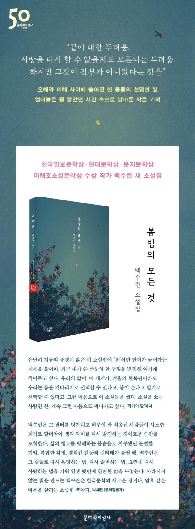 더 올곧고 선명하며 “강직한 빛”(해설, p. 263)으로 찾아온 백수린의 소설들은 상실과 긴 허무의 밤을 걷는 모두에게 새봄을 선사할 것이다.