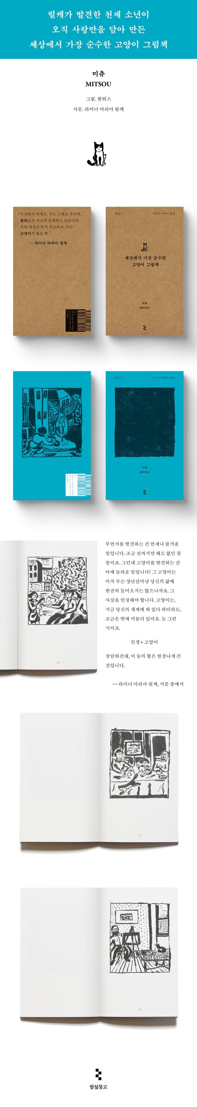 예술가이던 부모님의 영향을 받아 책과 그림을 끼고 살았던 발튀스는 그때부터 본격적으로 자기 그림을 그리기 시작했다. 길고양이 미츄를 만난 순간부터 다시는 미츄를 보지 못하게 된 날까지, 사랑하는 고양이와 함께한 시간을 40점의 연작 그림으로 담은 것이다. 그 그림들은 기나긴 작별 인사였다.