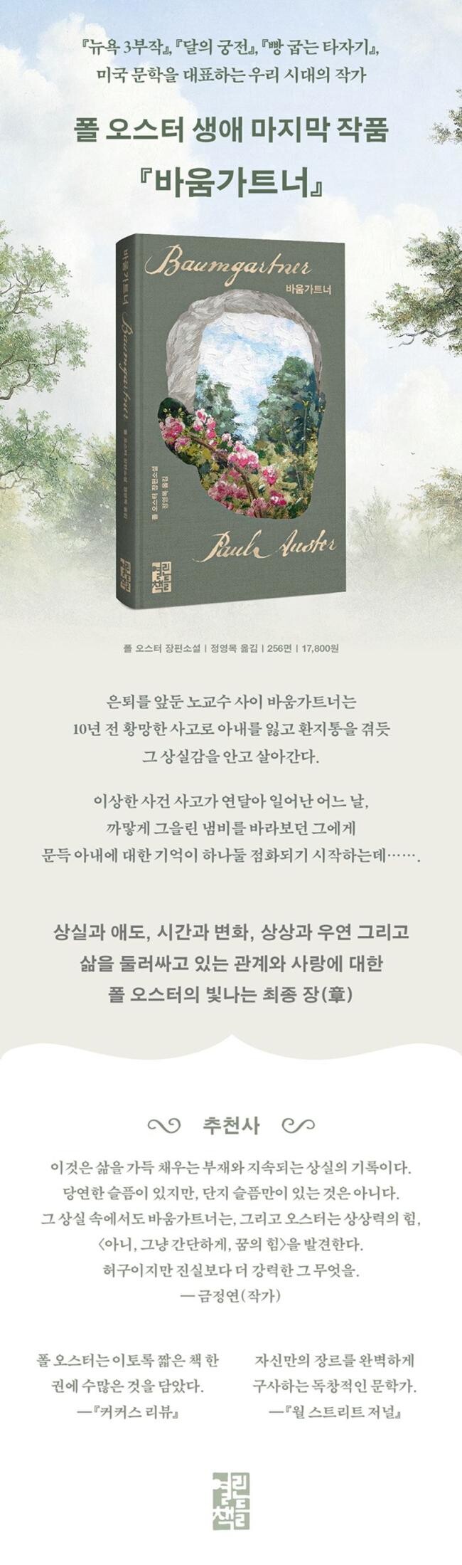 〈정원사〉라는 뜻을 가진 그의 성씨와 같이, 바움가트너는 기억의 정원을 걸으며 나뭇가지처럼 얽혀 있는 삶의 단편들을 하나하나 찾아가기 시작한다. 소설은 1968년 뉴욕에서 가난한 문인 지망생으로 아내를 처음 만난 이후 함께한 40년간의 세월, 뉴어크에서의 어린 시절, 옷 가게 주인이자 실패한 혁명가였던 폴란드 출신 아버지에 대한 회상까지 여러 장면들과 에피소드들을 펼쳐 보이며 한 인물의 내적인 서사를 따라간다. 『4 3 2 1』(열린책들, 2023) 이후 6년 만에 펴낸 장편소설이면서 그와 대조적으로 200면 남짓한 짧은 작품으로, 폴 오스터가 평생을 다뤄 왔던 주제인 글쓰기와 허구가 만들어 내는 진실과 힘, 그리고 우연의 미학에 대한 사유가 간결하고도 집약적으로 담겨 있는 기념비적 소설이다.