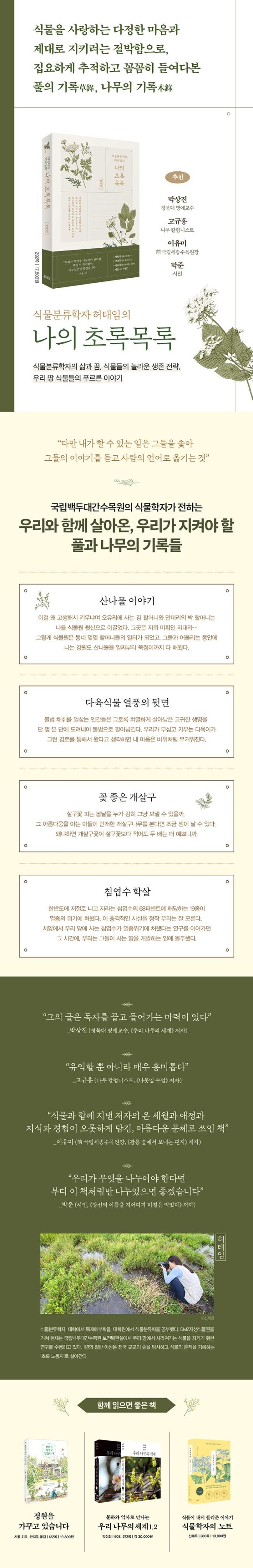 DNA 수준으로 깊이 깊이 들어가 그 식물의 계통을 밝혀내는 연구들이 주를 이루는 시대에, 현장 곳곳을 발로 밟고 눈앞에 살아 존재하는 식물을 하나하나 직접 만나 인연을 맺어온 시간이 누적되어 있는 사람, 그래서 식물이 연구의 대상에서 더 나아가 오랜 친구처럼, 연인처럼 감정이 이입되어 보기만 해도 설레어 가슴 뛰는 존재가 된 사람, 웃고 울며 결국은 꽉 찬 마음으로 돌아와 평생을 그들과 함께하는 삶을 꾸려가는 사람은 흔치 않습니다. 《나의 초록목록》은 그런 사람이 식물과 함께 지낸 온 세월과 애정과 지식과 경험이 오롯하게 담긴, 아름다운 문체로 쓰인 책입니다. 많은 이들이 이 책을 통해 그의 식물 여정에 함께하고 동화되어 언젠가 한분 한분 자신만의 초록목록을 만들면 좋겠습니다. 그 과정은 마음 따뜻해지는 초록 행복일 것입니다.