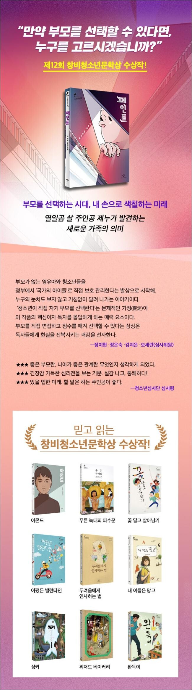가족 중심 사회이자 부모 자식 간의 끈끈한 유대가 여전히 중시되는 한국 사회를 살아가는 우리들에게 제누와 여러 인물들이 던지는 물음은 결코 가볍지 않은 문제의식을 불러일으킨다. 재산이 많으면 좋은 부모일까? 인품이 훌륭하면 좋은 부모일까? 부모는 반드시 필요한 존재일까? 소설 『페인트』는 부모의 그늘에서 쉽사리 벗어나기 어려운 10대의 억압된 심리를 위로하는 동시에 흥미로운 전개로 해방감을 맛보게 하면서 자아의 균형을 찾도록 이끈다. 134명의 초?중?고등학생으로 꾸려진 청소년심사단이 이번 수상작에 대해 “통쾌하다!”, “실감 난다!”, “할 말은 하는 주인공이 좋다.” “내 이야기 같다.” 등 응원의 마음이 담긴 호평을 쏟아낸 이유도 이 때문일 것이다.