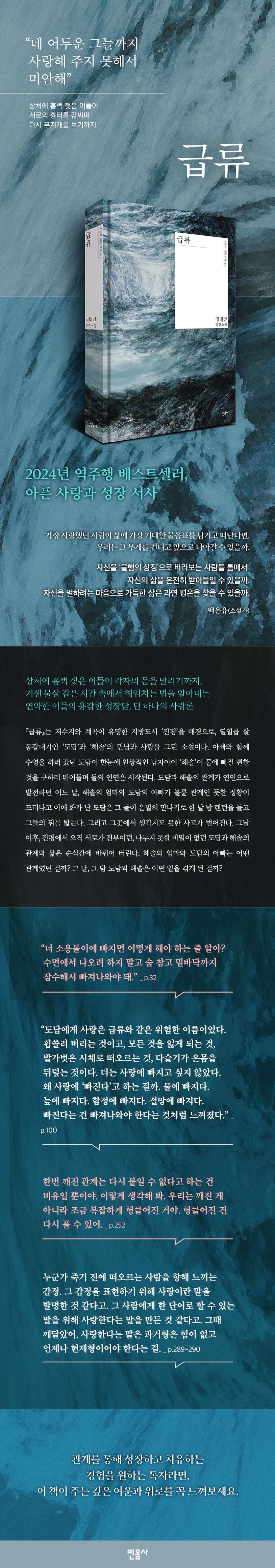 시간이 흐르며 그들이 마주하게 된 사랑과 진실들은 각기 다른 유속과 방향으로 흐르는 물처럼 한 가지가 아니지만, 각자의 물살에 따라 살아가던 도담과 해솔은 몇 번이고 서로를 향한 끌림, 애처로움과 죄의식, 그리고 사랑하는 마음을 느낀다. 사랑을 이루는 감정은 하나가 아니며, 그러므로 사랑의 성질 역시 다이아몬드처럼 순정한 한 가지가 아니라 시간의 흐름에 따른 여러 감정이 축적된 퇴적암에 가까울 것이다. 이처럼 『급류』는 우리가 누군가를 사랑하게 되는 일이 단 한 가지 모양이 아닐지 모른다고 이야기하는 소설이다. 사랑에 눈뜨고, 배신당하고, 사랑을 믿고, 믿지 않고, 사랑에 빠지기를 두려워하거나 혹은 그럼에도 다시 사랑을 해 보려는 이들이 이 소설에는 등장한다. 언제나 잔잔할 것만 같던 수면이 한순간 예상치 못한 깊이와 속도로 깊고 거세지는 물 같고, 따뜻하게 쬘 줄만 알았던 불꽃이 순식간에 다가가지 못할 정도로 뜨겁게 치솟는 불 같은 것. 그만큼 예상치 못한 사랑의 성질을 우리는 어느 정도까지 깊이 경험할 수 있을까? 용감하게 몸을 던져 깊은 물의 바닥까지, 뜨거운 불의 안쪽까지 들어갔다 나온 사람들의 이야기를 읽으며 우리는 사랑을 한 뼘 더 가늠해 볼 수 있게 될 것이다.