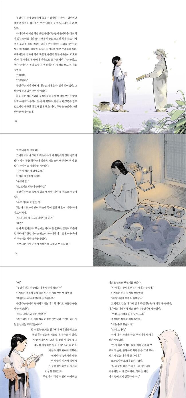 상황이 버겁지 않느냐는 효진 아가씨의 물음에 푸실이는 이렇게 답한다. “버겁기는 하나 원망하지는 않습니다.” 원망하는 마음은 나아가지 못하게 한다는 푸실이의 당찬 마음가짐은 열두 살 소녀가 맞닥뜨린 차별과 관습의 벽보다 훨씬 견고하다.