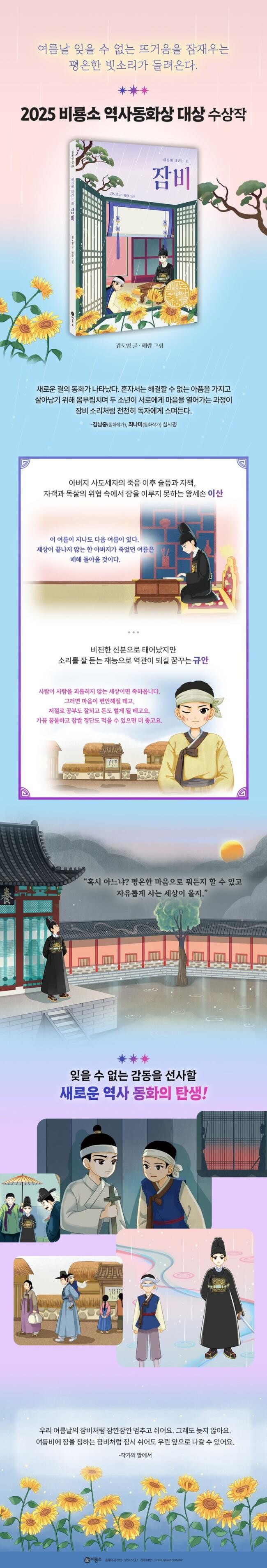 사도세자의 아들 이산의 이야기야 너무도 유명하지만 여기에 얼자 규안이의 사연이 더해져 새로운 결의 동화가 나타났다. 일인지하 만인지상의 왕세손임에도 수많은 정적들에 의해 목숨을 위협받는 이산, 얼자로 태어나 집안의 구박덩이인 규안은 서로에게 너무나 이질적인 존재들이다. 혼자서는 해결할 수 없는 아픔을 가지고 살아남기 위해 몸부림치며 두 소년이 서로에게 마음을 열어가는 과정이 여름날 잠을 부르는 빗소리, 잠비 소리처럼 천천히 독자에게 스며든다. -김남중(동화작가), 최나미(동화작가)
