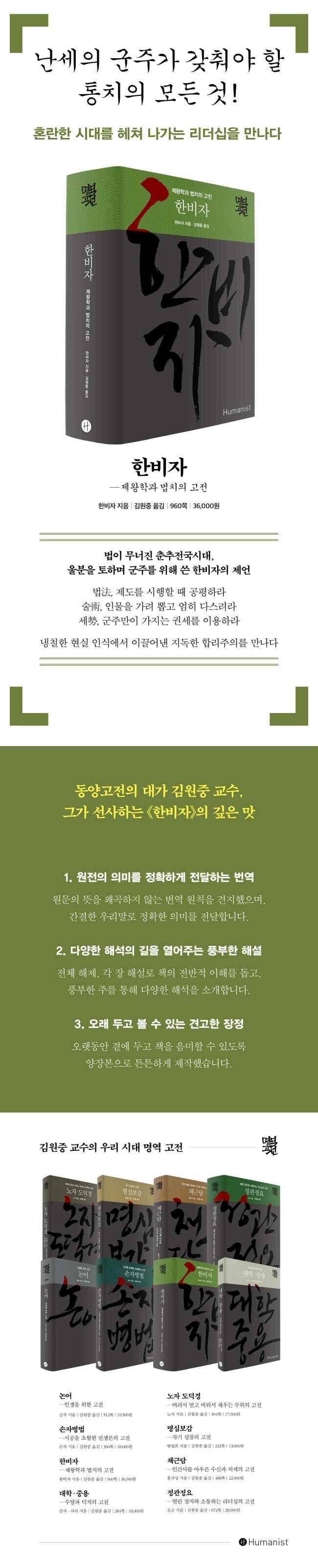 난세의 군주가 갖춰야 할 통치의 모든 것,《한비자》세계 최초의《사기》번역자 김원중 교수의 번역으로《한비자》완역판 출간!사마천의 《사기》를 세계 최초로 개인이 완역했던 고전 번역의 대가 김원중 교수(단국대학교 한문교육과)가 17년 만에 《한비자》의 완역본을 출간했다. 기존의 출간본이 위작시비가 있었던 20여 편을 제외하고 번역 출간했던 것을 이번에 모두 완역하고 기존의 번역도 더욱 가다듬었다. 이번 완역판은 천치여우의 《한비자교석》을 저본으로 삼아, 왕선신의 《한비자집해》 등을 참조하였고, 필요한 경우 여러 판본을 놓고 교감했다.춘추전국시대의 혼란기에 제왕들에게 난세를 평정하고 나라를 세워 오랫동안 통치할 수 있는 해법을 제시하는 《한비자》는 진시황에 의해 읽힌 뒤, 중국의 통치술에 관한 고전으로 널리 읽혔을 뿐만 아니라, 사상적으로는 법가사상을 집대성한 고전으로 꼽혀 왔다.한비자가 제시하는 통치원리는 법 · 술 · 세라는 세 가지에 입각해 있다. 군주가 나라를 통치해야 할 때 가장 의존해야 할 근거로 ‘법’을 들었고, 신하들을 잘 부려 군주의 자리를 굳게 다지는 인사정책을 ‘술’로 들었으며, 군주만이 가지는 유일하고 배타적인 권위를 ‘세’로 들어 설명하고 있다.인간을 섣불리 믿지 않고 시스템과 정치술을 통해 군주의 자리를 확고히 해야 한다는 입장은 한편으로는 군주 독재일 수도 있으나, 현대의 관점에서 보면 법에 철저히 기반하는 법치주의 정치학의 진면모를 볼 수 있다. 무엇보다도 현실적인 경쟁 체제의 비정함을 체감하고 실제로 군주가 제대로 통치할 수 있는 아주 구체적이고 실용적인 방법을 평생에 걸쳐 모색한 한비자의 목소리는 지금 읽어도 시사하는 바가 매우 크다.1. 법이 무너진 시대, 울분을 토하며 군주를 위해 쓴 제언, 한비자- 춘추전국시대의 혼란에도 자신을 알아주지 않는 제후들을 원망하며 쓴 통치의 교과서춘추전국시대는 말 그대로 ‘난세’였다. ‘전국戰國’이라는 표현에서 알 수 있듯이 그야말로 싸움이 끊이지 않았던 시대였기 때문에, 나라는 나라끼리, 제후는 제후대로 저마다 생존하기 위해 전력을 다하지 않을 수 없었다. 따라서 살아남기 위해 유세가들은 저마다 나라를 세우고 다스리는 방법, 싸움에서 이기는 방법 등을 각 나라의 제후들을 찾아다니며 설파하여 자신의 뜻을 펼칠 기회를 엿보았다. 그러나 한비자는 그 뛰어난 재능을 펼쳐내지 못하고 울분을 삼키며 《한비자》라는 책에 제후들이 지녀야 할 통치술의 모든 것을 담아냈다.한비자는 자신의 고향인 한나라의 왕이 나라를 다스리고 부강하게 하는 데 힘쓰지 않고, 실속 없는 인사들을 등용해 실제로 공이 있는 사람보다도 높은 대우를 하고, 유가의 경전에 입각해 왕에게 유세하는 사람들을 총애하다가, 정작 위급할 때는 실제로 싸울 수 있는 무사를 허겁지겁 등용하는 태도에 실망했다. 그래서 법으로써 나라를 다스리는 방법을 왕에게 제안했으나 받아들여지지 않자, 《한비자》라는 책을 지었다.《한비자》가 세상에 나온 뒤 진시황이 우연히 이 책을 읽고 감동하여 한비자를 직접 만나기를 원했다. 그러나 아이러니하게도 진시황이 직접 한비자를 만난 뒤, 한비자의 친구였던 이사의 모함으로 한비자는 진나라에서 죽임을 당하게 된다. 진시황은 뒤늦게 후회하여 한비자의 사상을 근간으로 진나라의 통치를 정비했다.한비자가 내세운 통치론의 핵심은 세 가지로 압축된다. ‘법’, ‘술’, ‘세’가 그것이다. 한비자는 현명한 군주는 제도를 시행할 때 공평하게 원칙을 지키고(‘법’), 인물을 가려 뽑는 데 귀신같이 밝았으므로 군주를 비방하거나 곤경에 빠뜨리는 자가 없었고(‘술’), 권세를 이용해 법을 엄하게 시행해도 군주의 뜻을 거스르는 백성이 없다(‘세’)고 보았다. 특히 한비자의 ‘법’사상은 지위의 높낮이에 관계없이 모든 사람들이 따라야 하는 행위준칙으로 모든 현실적인 대처에 우선하는 통치의 근간이 된다. 한비자는 구체적이고 체계적인 법조문을 만들지는 않았으나, 공이 있는 사람에게는 상을 주어 격려하고 죄를 지은 사람에게는 벌을 주어 뉘우치도록 하는 원칙을 강조했다. 한비자가 보기에 전국시대의 국제관계는 약육강식의 원리가 지배하므로 나라의 멸망을 피하려면 엄격한 법 집행을 통해 부국강병을 이루는 것이 가장 중요하다고 보았던 것이다.2. 현실의, 현실에 의한, 현실을 위한 고전- 현실을 날카롭게 파헤치고, 실제로 쓸 수 있는 방법을 모색한《한비자》한비자는 무엇보다 유가를 비롯한 제자백가들이 고대의 성현만을 숭상하는 태도에 매우 비판적이었다. 한비자는 역사는 진화하기 때문에 문제가 발견되면 시대와 환경 변화에 따라 새로운 방법으로 대처해야 한다고 보았다. 유명한 ‘수주대토’의 고사처럼 우연히 죽은 토끼를 기다리며 허송세월하는 태도보다는 구체적이고 현실적인 대안을 고민하는 것을 중요하게 여겼다.한비자의 현실론은 군주와 신하의 기본적인 관계가 본능적으로 자신의 이익만을 추구하는 관계라고 본 것에서 출발한다. 이런 측면에서 인간의 본성을 선하게 