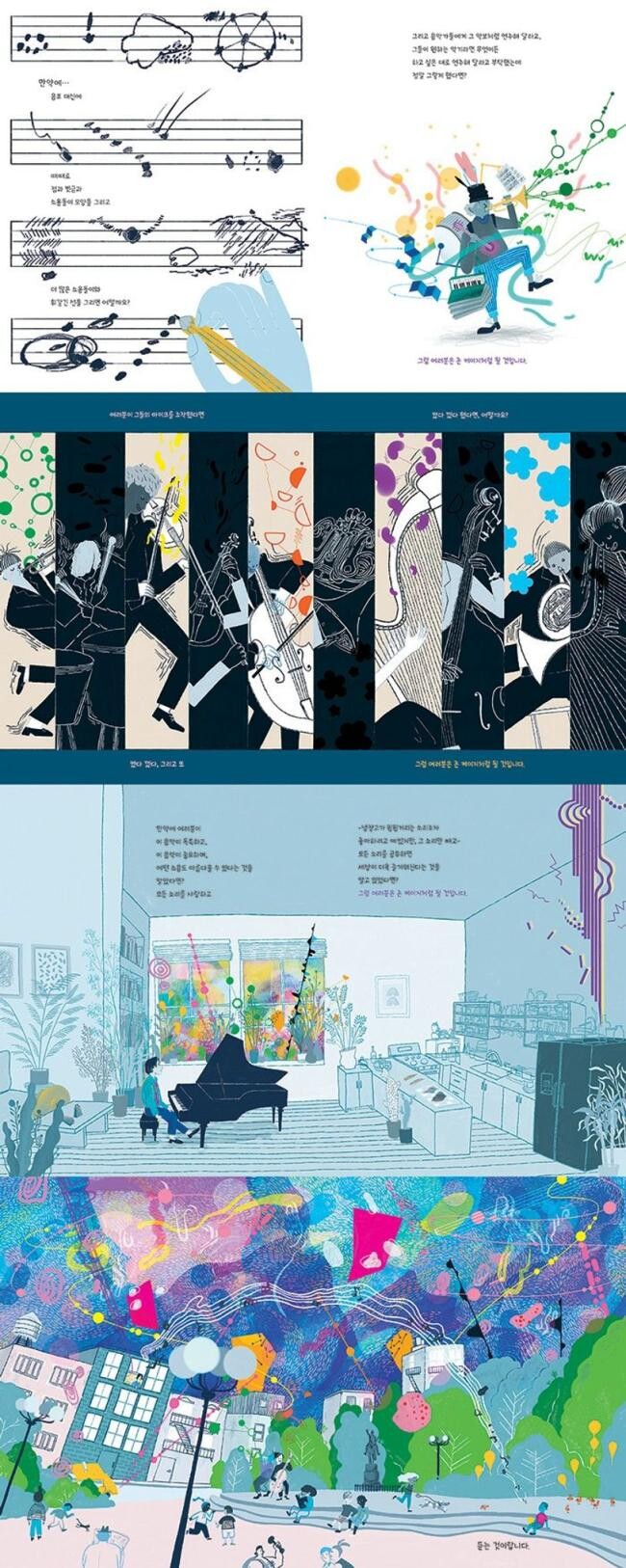 <북리스트> 추천도서<커커스 리뷰> 추천도서<혼 북> 추천도서 놀라운 상상력, 예리한 통찰, 깊은 사유!-우리 가슴을 뛰게 하는 위대한 예술가들의 특별한 이야기 속으로문이 쾅! 닫히는 소리, 믹서기가 윙윙대는 소리, 바람이 휙휙 지나가는 소리… 누구나 귀를 틀어막고도 남을 만한 소음이지만 이러한 소음까지 모두 음악이라고 믿었던 작곡가 존 케이지. 그는 이 그림책만큼이나 개성적이고 독특하다.어린이부터 어른까지 독자들에게 세계가 주목하는 예술가들의 특별하고 가슴 뛰는 이야기를 전하고자 보물창고에서 새로이 시작한 시리즈가 드디어 첫 책을 선보인다. 천재적인 작곡가 존 케이지의 음악 작품들을 환상적으로 재현하고 있는 『아름다운 소음』이 바로 그것이다. 한국인 일러스트레이터 나일성의 현란하고 역동적인 일러스트와 다양한 의성어의 나열, 역설적이고 반어적인 제목은 ‘아트’를 사랑하는 독자들의 시선을 사로잡기에 충분하다. 이러한 매력 덕분에 『아름다운 소음』은 <북리스트><커커스 리뷰><혼 북> 등 여러 저널의 추천도서로 선정되었다.보물창고의 『아름다운 소음』을 통해 독자들은 ‘4분 33초’를 비롯한 존 케이지의 유명한 작품들을 직접 듣는 듯 생생하게 볼 수 있다. 또한 소음조차 음악이 될 수 있다는 것과 음악은 귀로만 듣는 것이 아니라 눈으로도 볼 수 있다는 신기한 사실을 깨닫게 된다.음악계의 생태계 교란자이자 개척자 ‘존 케이지’- ‘모든 것이 음악’이 되는 특별한 시간정적 속에서도 미세한 소리를 들을 수 있다는 것을 눈치 챈 존 케이지는 아무도 상상하지 못한 음악을 작곡하기 시작했다. 그가 작곡한 악보에는 ‘조용히’라는 글자만 적혀 있을 뿐이었다. 연주회에서 숨소리조차 방해가 될까 숨죽이는 청중들의 노력이 무색하게도 그는 연주 중에 마이크 전원을 껐다 켜기를 반복했다. 『아름다운 소음』은 끊기지 않고 흘러나오는 ‘아름다운 소리’만이 음악이라고 생각하던 사람들의 편견을 가차 없이 부셔 버렸다.침묵 속의 소리를 찾아내고, 모든 소음이 특별하다는 것을 깨달은 존 케이지는 음악계의 생태계 교란자이며 동시에 개척자이기도 하다. 존 케이지처럼 탐구하고, 실험하고, 상상하고, 인내해 보자. 소리가 나는 과정과 사람들의 반응, 소리와 소리의 겹침을 즐겨 보자. 그저 시끄럽고 짜증스러운 ‘소음’이나 ‘잡음’이라고 생각하던 것을 새롭게 받아들이는 태도는 우리 삶을 조금 더 다채롭고 유연하게 바꾸어 줄 것이다. 또한 모든 것을 음악으로 만드는 존 케이지의 실험정신은 아이들에게 창의적인 영감을 줄 것이다.언제 어디에서든, 누구와 무엇을 하든, 이어폰을 귀에 꼽지 않고도, 내가 있는 모든 곳에서 음악을 들을 수 있다! 그렇다면 당신은 이미 ‘존 케이지’가 되었을지도 모른다.