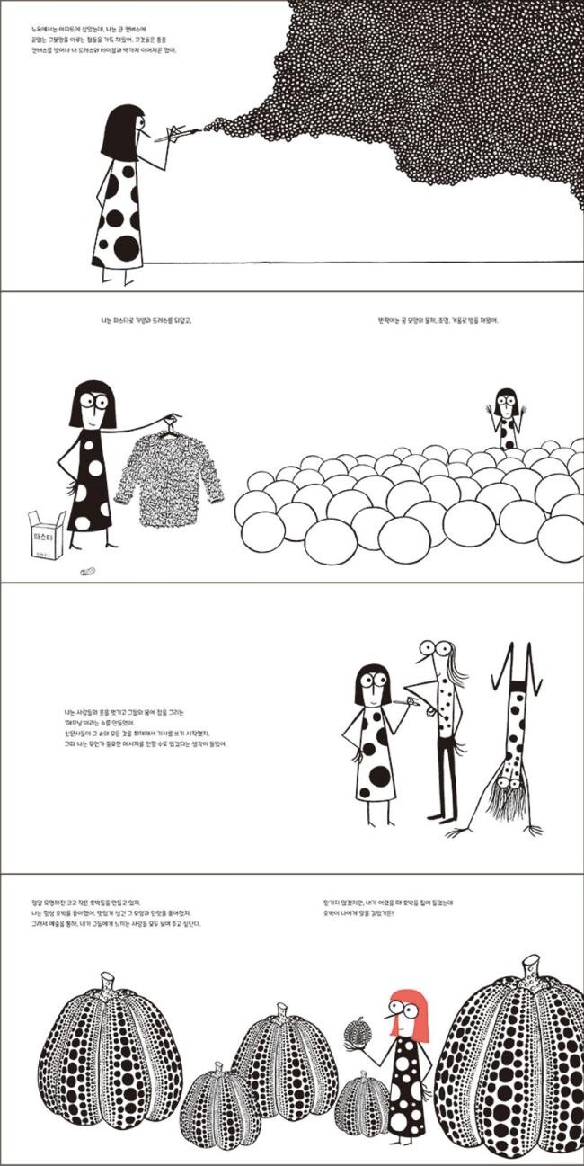 먹으로만 그린 간결한 일러스트는 독자들이 그녀의 암울하고 순탄치 않았던 삶에 몰입할 수 있도록 도와준다. 반면에 표지를 들추면 드러나는 ‘노란색’ 바탕에 ‘검은 땡땡이’가 확산되는 면지는 쿠사마의 의식 세계와 작업 세계를 보여 주고 있으며, 시작과 끝에 딱 두 번 ‘빨간색’으로 표현된 쿠사마의 머리카락은 쿠사마 야요이가 고수하고 있는 캐릭터를 특징적으로 잘 나타내고 있다.