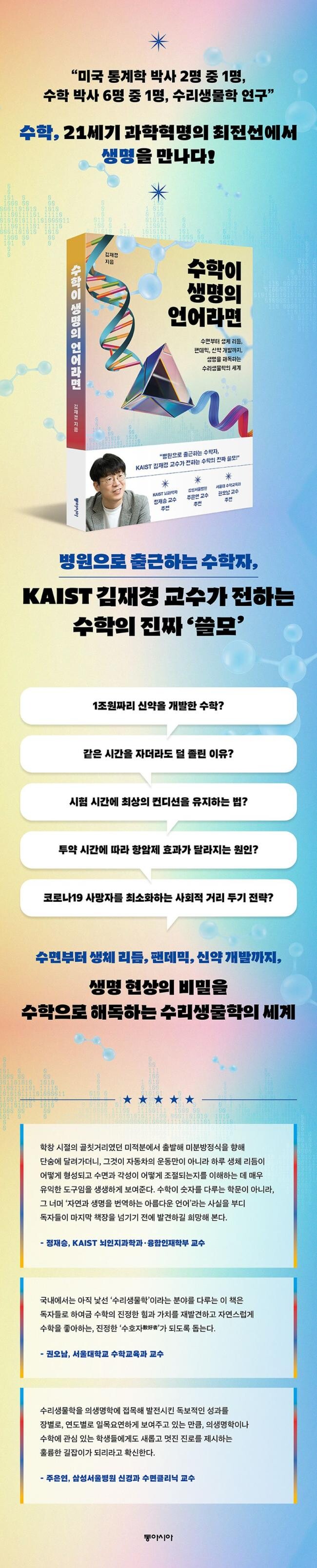 “『수학이 생명의 언어라면』은 김재경 교수의 지난 10여 년간의 수리생물학을 향한 애정, 열정, 그리고 도전 정신을 담고 있다. 특히, 수리생물학을 의생명학에 접목해 발전시킨 독보적인 성과를 장별로, 연도별로 일목요연하게 보여준다. 이 책이 의생명학이나 수학에 관심 있는 학생들에게 새롭고 멋진 진로를 제시하는 훌륭한 길잡이가 되리라고 확신한다.”