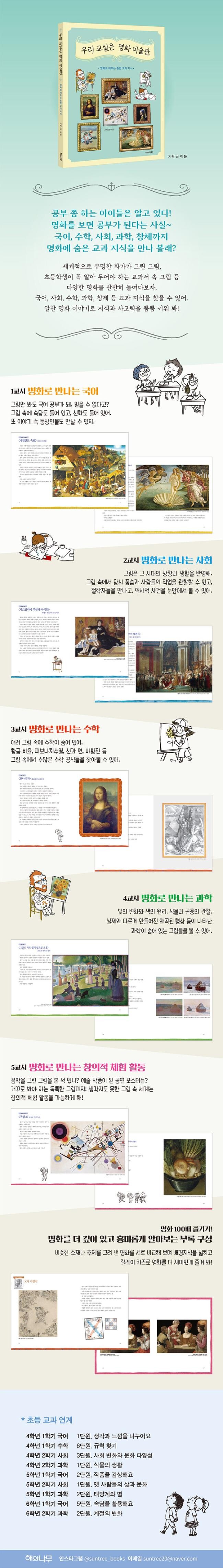 《우리 교실은 명화 미술관》은 이러한 시대적 배경에서 착안하여 기획되었다. 명화를 감상하는 것에서 더 나아가 미술에서 국어, 사회, 과학, 수학, 창의적 체험 등 다양한 교과 지식을 찾아보며 융합적 사고력을 갖출 수 있도록 돕는다. 딱딱한 설명 글 대신 친숙한 입말체의 화자가 등장해 다소 어려울 수 있는 명화 이야기를 말랑말랑하게 풀어 준다. 교과 지식뿐 아니라 명화를 그린 작가들의 이야기 또한 살펴볼 수 있으며, 비슷한 주제와 소재를 다룬 명화를 비교해 보는 코너와 ‘릴레이 명화 퀴즈’로 명화에 대한 다양한 놀이와 퀴즈 등을 즐길 수 있다.