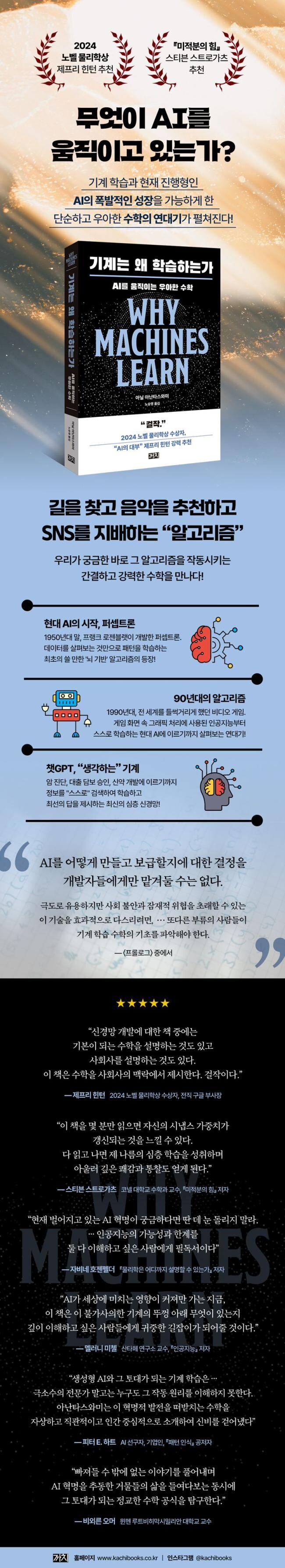 이 책은 AI가 내놓는 엄청난 결과물 이면에 있는 단순하지만 우아하고 강력한 수학 원리를 핵심 위주로 살펴본다. 독자들의 이해를 돕기 위해서 많은 그래프를 이용해서 수학 개념을 시각화하고, “수학적 코다”라는 절에서는 수학의 원리를 간결하게 정리하여 증명한다. 그래프와 수식의 바다에서 독자들은 AI를 움직이는 핵심적인 수학 개념과 원리를 파악함으로써 현재 엄청난 속도로 발전하고 있는 AI를 보다 선명하게 이해하게 될 것이다.