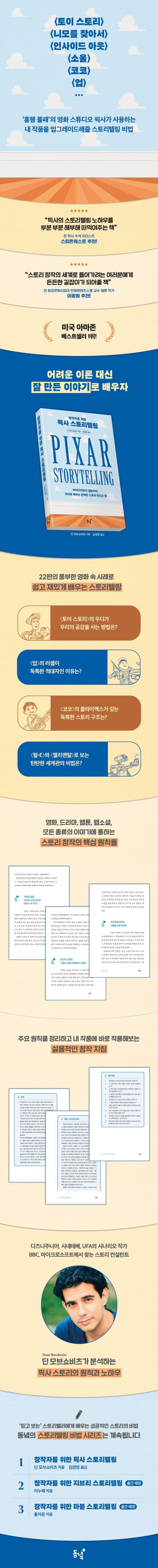 훌륭한 스토리를 쓰기 위한 가장 기본적인 방법은 좋은 전범을 찾아 장점을 분석하고, 그것을 자신의 작품에 적절히 녹여내는 것이다. 이를 위하여 완성도 높은 스토리와 뚜렷한 개성으로 ‘믿고 보는’ 영화 스튜디오로 자리 잡은 브랜드들의 ‘성공 레시피’를 파헤치는 ‘스토리텔링 비법 시리즈’가 새로 나왔다. 그 첫 번째 주인공은 안정적이고 짜임새 있는 스토리 구조와 독창적이고 환상적인 세계관, 흡인력 있는 전개와 울림을 주는 메시지로 전 세계의 사랑을 받는 애니메이션 스튜디오 ‘픽사’다. 이 책은 〈토이 스토리〉, 〈니모를 찾아서〉, 〈라따뚜이〉, 〈월-E〉, 〈업〉, 〈인사이드 아웃〉, 〈코코〉, 〈소울〉, 〈엘리멘탈〉 등 픽사의 수많은 명작을 분석하여 스토리 창작자가 곧바로 활용할 수 있는 효과적인 스토리텔링 기법들을 소개한다.
