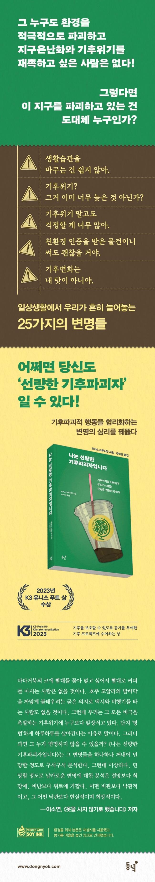 바다거북의 코에 빨대를 꽂아 넣고 싶어서 빨대로 커피를 마시는 사람은 없을 것이다. 호주 코알라의 발바닥을 까맣게 불태우려는 굳은 의지로 택시와 비행기를 타는 사람도 없을 것이다. 그런데 우리는 그 모든 비극을 촉발하는 기후위기에 누구보다 앞장서고 있다. 단지 ‘평범’하게 하루하루를 살아간다는 이유로 말이다. 그러니 과연 그 누가 변명하지 않을 수 있을까? 《나는 선량한 기후파괴자입니다》는 그 변명들을 하나하나 꺼내어 민망할 정도로 구석구석 분석한다. 그런데 이상하다. 민망할 정도로 날카로운 변명에 대한 분석은 절망보다 희망에, 비난보다 위로에 가깝다. 어떤 비관보다 낙관적이고, 그 어떤 낙관보다 현실적이며 희망적이다.