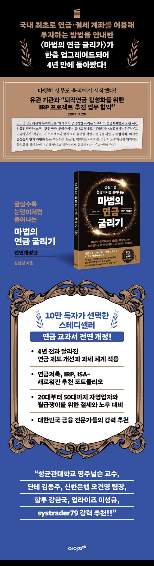 ‘마법의 연금 굴리기’는 연금 투자의 모든 측면인 투자 스킬부터 제도적인 부분까지 두루 다루고 있어 우리나라 연금 투자에 관한 책 중에서 단연 최고다.