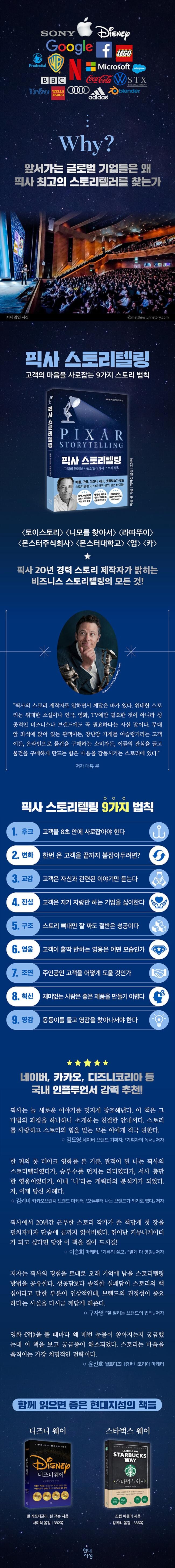 이상과 같이 『픽사 스토리텔링』은 저자가 픽사에서 스토리텔러로, 그리고 수많은 기업의 비즈니스 컨설턴트로 활동하면서 깨달은 “고객의 마음을 사로잡는” 스토리 법칙을 후크, 변화, 교감, 진심, 구조, 영웅, 조연, 혁신, 영감 등 9가지 키워드로 정리했다. 이 책은 마케팅, 브랜딩, 세일즈, 기획, 프레젠테이션, 리더십 등 모든 비즈니스 커뮤니케이션 영역에서 탁월한 스토리텔러가 되는 핵심 비법을 아낌없이 알려준다.