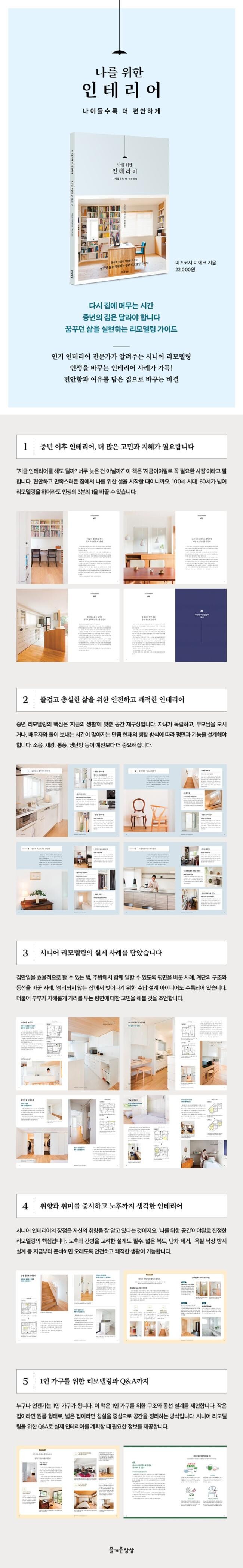 누구나 언젠가는 1인 가구가 됩니다. 이 책은 혼자서도 안전하고 편안하게 살 수 있는 구조와 동선 설계를 제안합니다. 작은 집이라면 원룸 형태로, 넓은 집이라면 침실을 중심으로 공간을 정리하는 방식입니다. 더불어 반려동물과 함께 행복하게 살기 위한 팁도 알려드립니다. 책 말미에는 시니어 리모델링을 위한 Q&A로 실제 인테리어를 계획할 때 필요한 정보를 제공합니다.