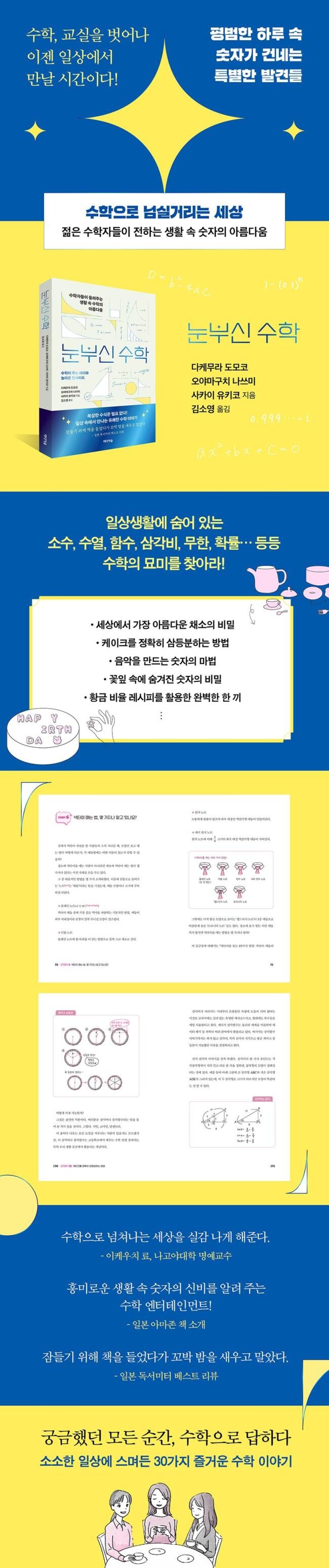 이 책은 소수, 수열, 함수, 삼각비, 무한, 확률, 매듭, 랜덤워크 같은 다양한 수학적 주제를 다룬다. 언뜻 어렵게 느껴지는 이런 주제들도 대부분 우리 일상에서 발견할 수 있는 흥미로운 수학적 수수께끼에서 출발한다. 일본 학계의 신진 여성 수학자 세 명은 평범하고 직관적인 설명으로 수수께끼를 풀어내면서도, 친숙한 칠판 필기 스타일로 간단한 증명을 제시하여 독자가 “아, 그렇구나!” 하고 자연스럽게 이해할 수 있도록 돕는다.