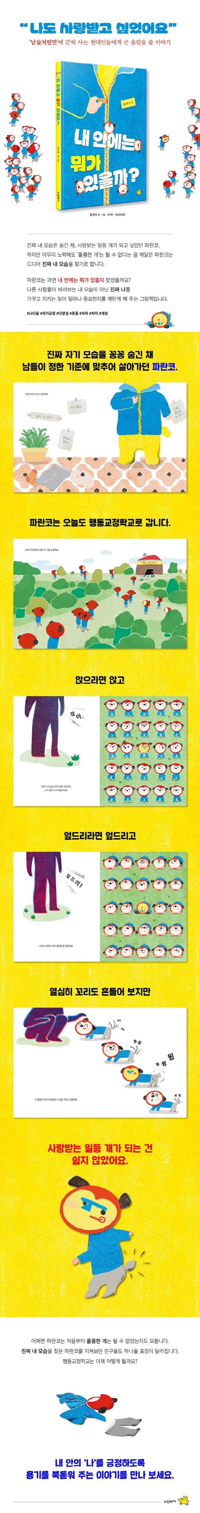 《내 안에는 뭐가 있을까?》는 진짜 나를 억누른 채 남들이 정한 기준에 맞춰 살아가던 파란코가 끝내는 자기 자신을 찾아가는 모습을 그린 그림책입니다. ‘화가 나도 참기, 짖지 않기, 물어뜯지 않기, 선생님 말씀 잘 듣기’는 착하고 훌륭한 개가 갖추어야 할 덕목이에요. 훌륭한 개가 되려는 수많은 개들은 오늘도 ‘행동교정학교’로 갑니다. 행동교정학교에서는 그 어떤 눈에 띄는 행동도 받아들여지지 않아요. 자기를 드러내는 일은 금기거든요. 앉으라면 앉고, 엎드리라면 엎드리고, 달리라면 달려야 합니다. 파란코도 열심히 노력했어요. 하지만 쉽지만은 않았지요. 저마다 엎드린 모습이 조금은 다를 수도 있잖아요? 살랑살랑 흔들기에는 꼬리가 너무 짧을 수도 있고요. 하지만 행동교정학교에서는 한 치의 다른 모습도 받아들여지지 않아요.