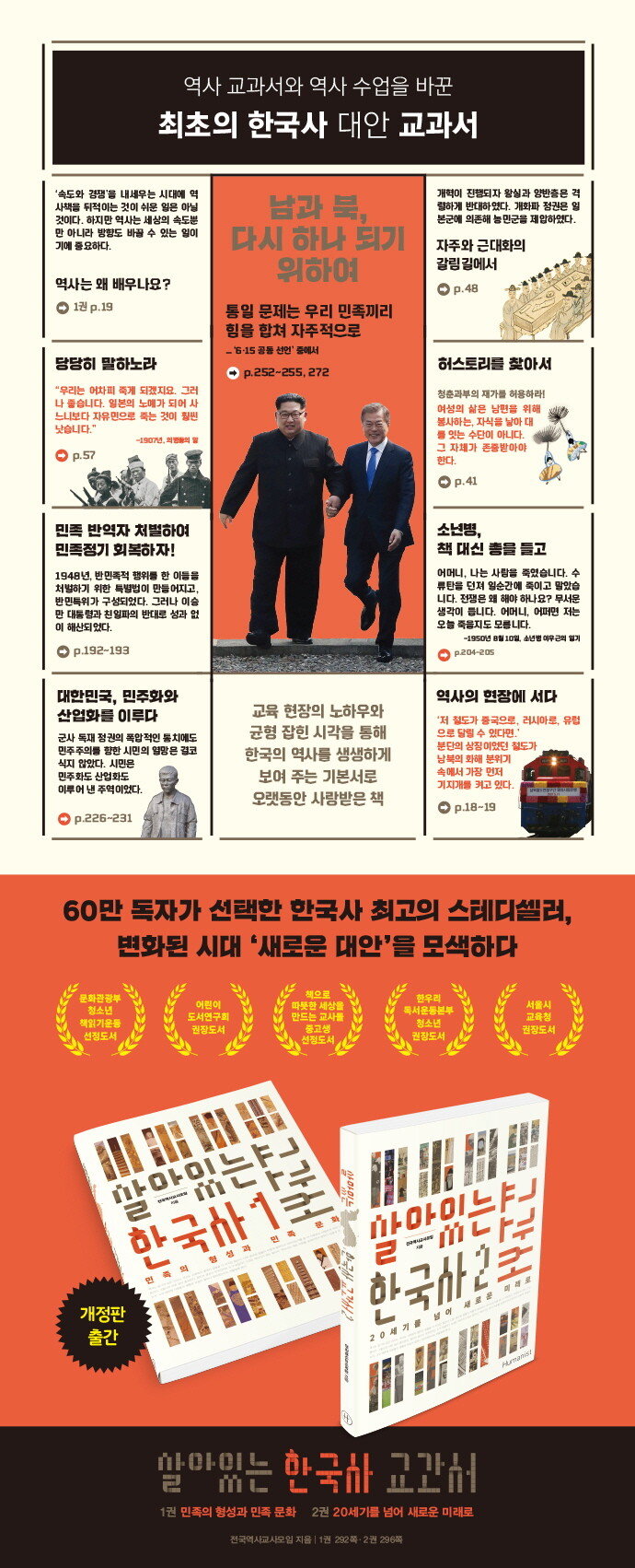 특히, 이번 개정증보판에서는 최신의 연구 성과를 반영함은 물론, 1987년 6월 항쟁 이후의 역사를 대폭 강화했다. 6월 항쟁 이후 30여 년은 여러 어려움 속에서도 민주주의와 평화로 가는 길을 열었던 시기로 정리했다. 진보와 보수가 경합하고, 시민 참여를 통해 민주주의가 확산되고 평화로 가는 길이 새롭게 열리게 된, 가장 가까운 시기까지의 역사도 비중 있게 정리했다. 역사적 맥락 위에서 오늘을 돌아보고 더 나은 미래를 설계하는 데 이 책이 조금이나마 도움이 되기를 희망한다.ㅁ