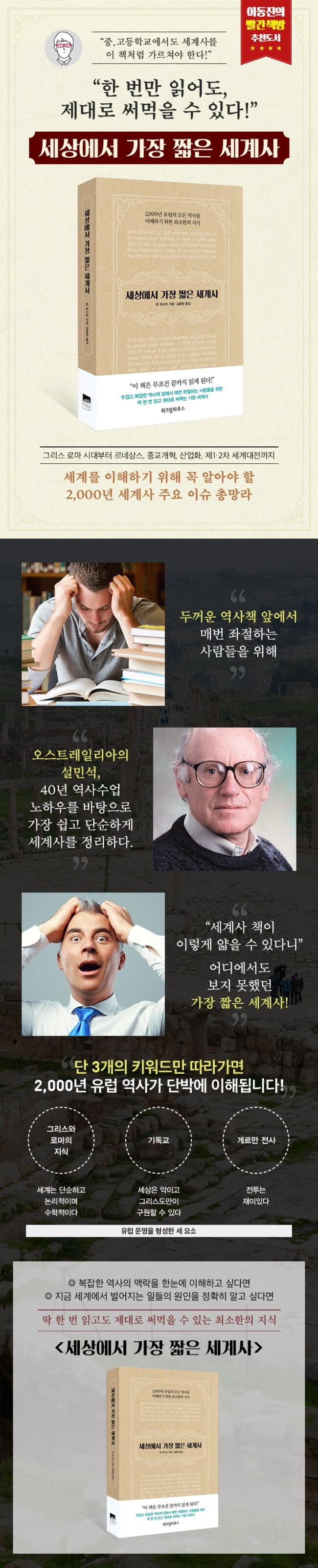 하지만 시간이 갈수록 역사라는 학문 자체에 대한 관심이 줄어들고, 세계사를 가르칠 시간은 부족한 것이 현실이다. 이 열악한 환경을 어떻게 극복하고 효과적으로 세계사를 가르칠 수 있을지 오래 고민하고 연구한 끝에 이 책이 탄생하게 되었다. 존 허스트는 아무리 외워도 어차피 잊어버릴 수많은 사건과 인물을 구체적으로 언급하는 대신, 역사를 바꾼 문명의 본질적인 요소들을 포착하고 그것들이 시간의 흐름에 따라 어떻게 변화하는지를 보여 준다. 또한 복잡한 세계사 속에서 자꾸만 길을 잃게 되는 독자들을 위해 간결하게 정리한 도표와 지도를 곁들여 대학의 교양 수업을 수강하며 세계사를 압축적으로 정리하는 듯한 지적 즐거움을 경험할 수 있다.