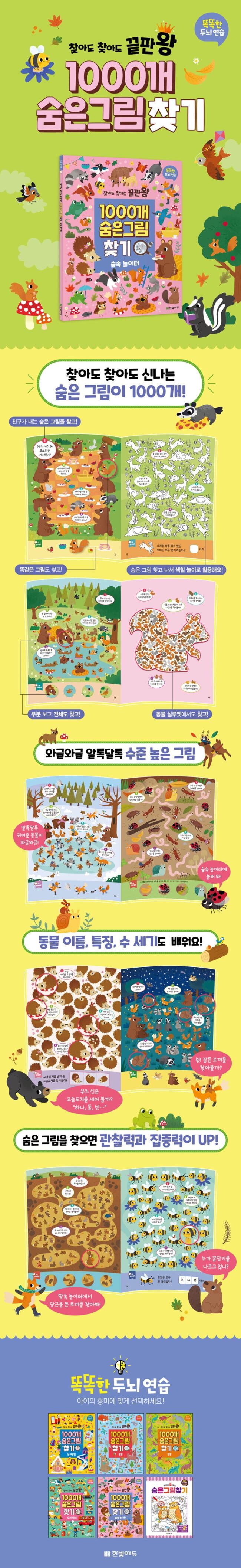 숨은그림찾기는 관찰력, 집중력, 판단력, 인지력, 문제해결력 등 두뇌의 고른 발달에 도움이 되는 활동입니다. 아이가 <찾아도 찾아도 끝판왕 1000개 숨은그림찾기> 시리즈를 즐기며 관찰력과 집중력을 쑥쑥 키울 수 있게 도와주세요.