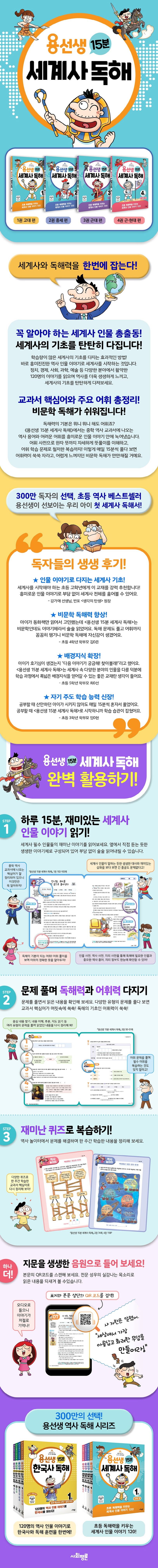 이러한 학부모와 어린이의 고민 해결을 위해 300만 독자가 선택한 초등 교육 전문 브랜드, 용선생이 나섰습니다. 그동안 『교양으로 읽는 용선생 세계사』, 『용선생 처음 세계사』, 『용선생이 간다』 등을 출간하며 어린이 역사 교육에 힘써 온 사회평론 역사연구소에서 비문학 독해 훈련을 강화하며 세계사의 기초도 완성하는 『용선생 15분 세계사 독해』를 선보입니다.