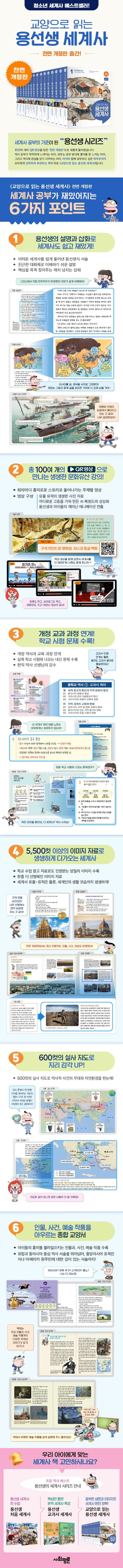 총 100여 개의 영상은 회차마다 다양한 주제의 영상을 흥미로운 스토리로 풀어나갑니다. 세계사 공부에 필요한 유물 유적의 생생한 사진 자료, 까다로운 고증을 거쳐 만든 AI 복원도와 상상화, 용선생과 아이들의 재미난 애니메이션 연출로 구성되어, 종이책의 한계를 벗어나 세계 곳곳의 유물과 유적지, 주요 세계사 사건과 인물의 에피소드를 흥미롭게 경험할 수 있습니다.