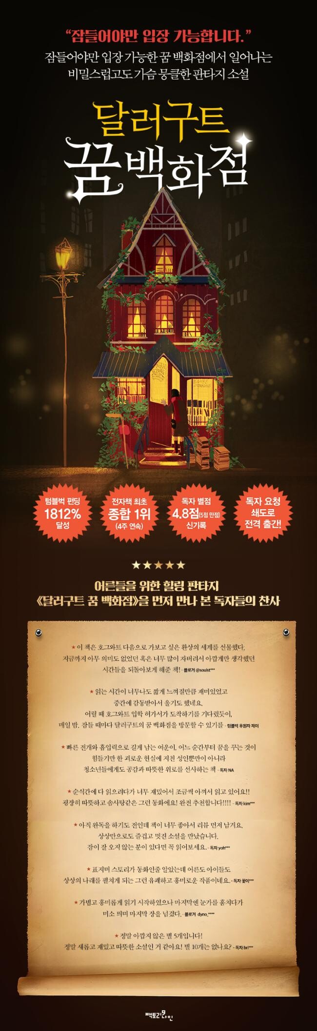독자 별점 4.8점(5점 만점)을 기록한 책이 있다. 별점도 400여 명이 남겼다. 독자 리뷰를 보면 ‘다 읽기도 전에 추천하고 싶은 마음에 별점 먼저 남기고 간다’, ‘다 읽어버리는 게 아까워서 천천히 아껴가며 읽고 있다’, ‘판타지 소설인데 나도 모르게 눈물을 흘렸다’ 등등 칭찬 일색이다. 이 책 《달러구트 꿈 백화점》은 전자책 플랫폼인 리디북스를 통해 공개된 후, 여타 유명 작가들의 책을 제치고 종합 베스트셀러 1위의 기염을 토하며 독자 별점 4.8점을 기록하는 등의 국내 도서로는 최고점의 신기록을 세우고 있다. 종이책을 전자책으로 요청하는 사례는 있어도, 전자책을 종이책으로 만들어 달라는 사례는 처음이다. 말 그대로 “역주행의 신화”로 종이책이 출간되었다.