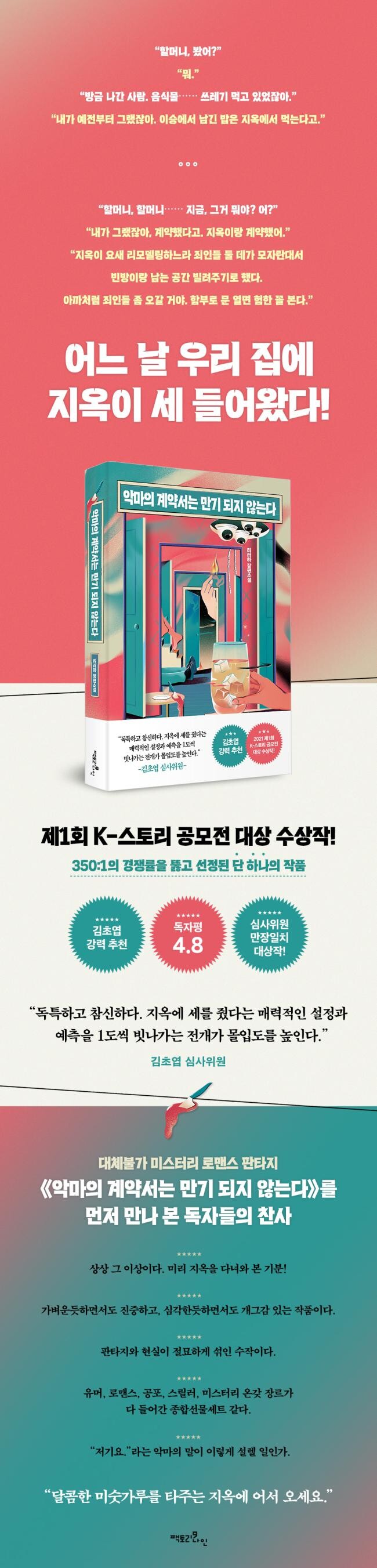 이 작품은 《달러구트 꿈 백화점》과 같이 재능 있는 작가들의 작품이 세계로 뻗어 나가기를 응원하며 쌤앤파커스와 리디북스가 공동으로 주최한 “제1회 K-스토리 공모전”의 대상 수상작이다. 350대 1의 경쟁률을 뚫고 선정된 《악마의 계약서는 만기 되지 않는다》는 장면 장면이 머릿속에 그려질 만큼 캐릭터가 개성 있고 생활감 넘치는 생생한 표현이 매력적인 작품으로 바로 영상로 진행되어도 손색이 없을 만큼 완성도 높은 작품이다. 잘 구성된 캐릭터 간의 케미와 독자의 예측을 1도씩 빗겨나가는 전개가 몰입도를 높이며, 마지막까지 독자들에게 즐거움을 선사한다는 심사평과 함께 100여 명의 독자 심사위원 및 내외부 심사위원들에게 높은 점수를 받으며 만장일치로 대상으로 선정됐다.