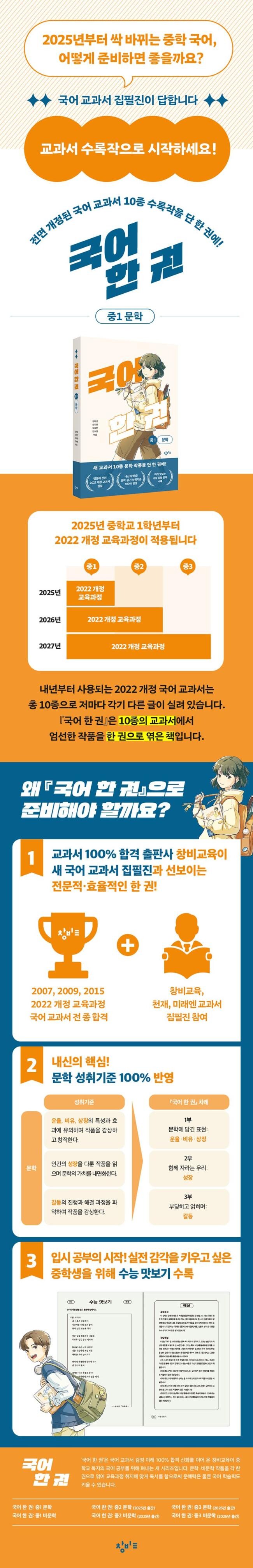 『국어 한 권: 중1 문학』은 시·소설·수필·시나리오 등 여러 갈래의 문학 작품을 ‘문학’ 영역 성취기준인 ‘운율·비유·상징’, ‘인물의 성장’, ‘갈등의 진행과 해결 과정’에 따라 묶었다. 또한 「하늘은 맑건만」, 「홍길동전」, 「자전거 도둑」 같은 교과서 단골 수록작부터 나태주 시인의 「별밤에」, 영화 「아이 캔 스피크」의 시나리오 등 교과서에 처음 소개되는 작품들까지 선별하여 소개함으로써 예비 중학생들이 작품을 폭넓게 살펴본 후 문학에 대한 자신감을 가지고 진학할 수 있도록 도왔다. 새 교과서 적용 시기에 맞춰 ‘국어 한 권: 중2’는 2025년에, ‘국어 한 권: 중3’은 2026년에 출간될 예정될 예정이다.