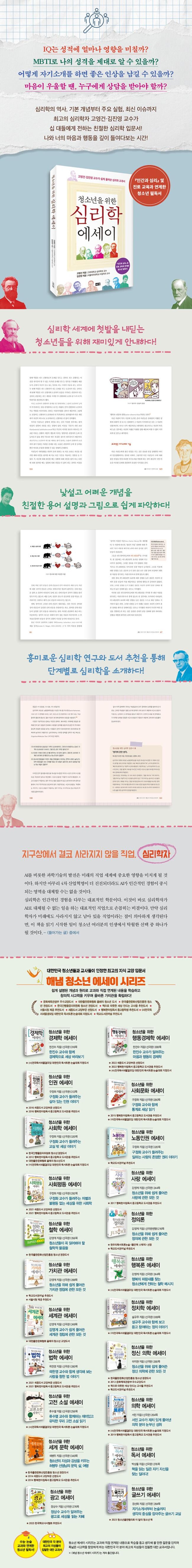 심리학은 인간적인 경험을 다루는 대표적인 학문이다. 이것이 바로 심리학자가 AI로 대체될 수 없는 일을 하는 대표적인 직업으로 손꼽히는 비결이다. 만약 심리학자가 미래에도 사라지지 않고 남아 있을 대표적인 직업이라는 점이 의아하게 생각된다면, 이 책을 읽기 시작한 일이 청소년 여러분의 인생에서 탁월한 선택 중 하나가 될 것이다.