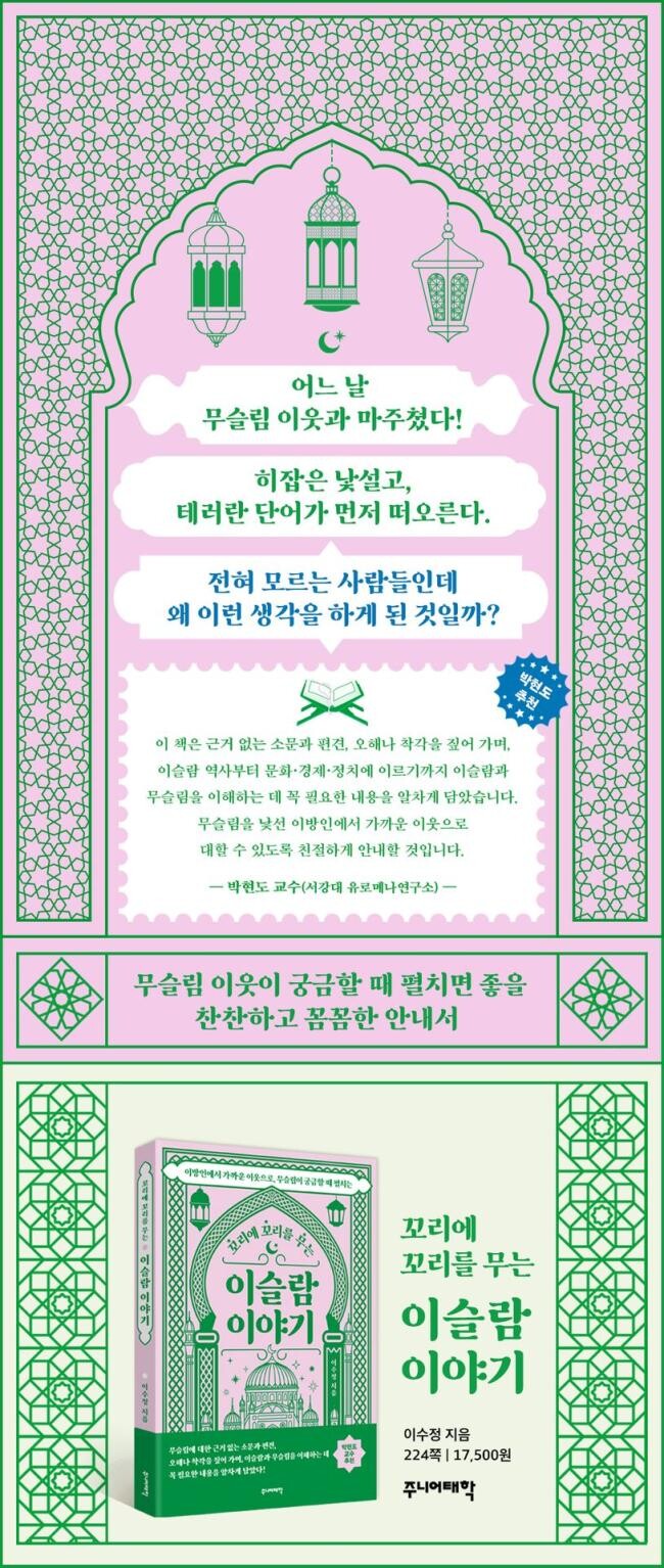 《꼬리에 꼬리를 무는 이슬람 이야기》는 이슬람 혐오가 왜 생겼는지에서 출발해 무슬림 이웃에 가닿는 이슬람과 무슬림에 관한 ‘입문서’다. 이슬람과 무슬림에 대한 아주 기본적인 내용부터 현대 이슬람 세계의 모습까지 찬찬히 알려 준다. <꼬꼬무 이야기> 시리즈는 기본적으로 질답 구성이다. 이 책에서 질문은 무슬림 이웃이 생겼을 때를 가정해 뽑았다. 우연히 무슬림 이웃과 마주쳤을 때 품은 질문이 시작점이다.