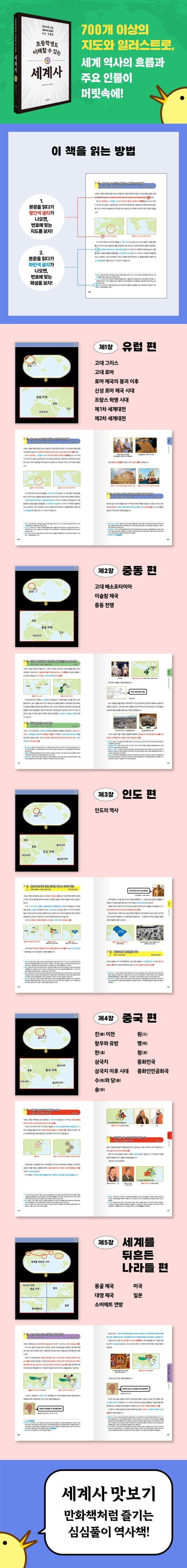 이 책은 700개가 넘는 지도와 일러스트로 각 대륙별 역사별 주요 인물별 흐름을 파악하기 쉽도록 구성되어 있다. 비록 유럽 중동 인도 중국과 세계에 엄청나게 많은 영향을 끼쳤던 나라들의 전체적인 역사 흐름만 살펴보고 있기는 하지만, 세계사를 간단히 맛보기에는 충분할 것이다.