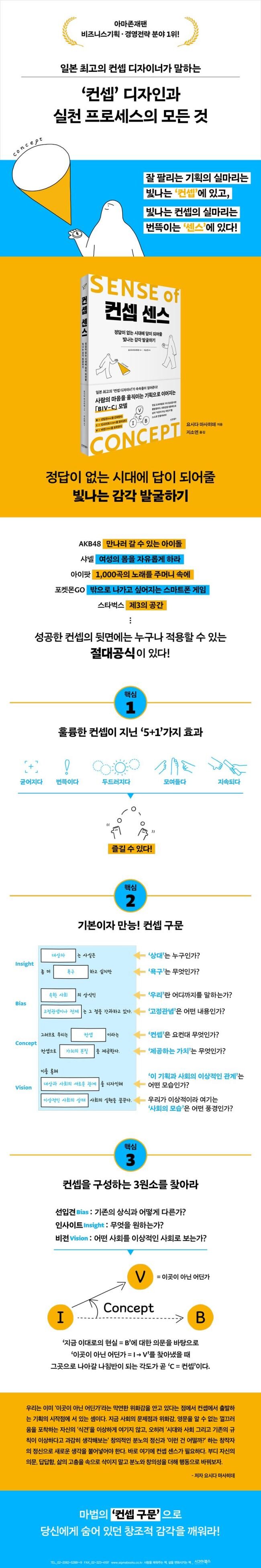 먼저 이 책의 1장에서는 지금 우리가 살고 있는 세계의 속성을 살펴보며, 왜 지금 다시 컨셉을 이야기해야 하는지 그 근본적인 이유를 탐구한다. 2장에서는 컨셉의 3가지 요소와 3가지 종류, 그리고 훌륭한 컨셉이 불러오는 5가지 효과에 대해 짚어본다. 다음 3장에서는 기본이자 만능이 되는 ‘컨셉 구문’과 ‘인사이트(I)’, ‘선입견(B)’, ‘비전(V)’이라는 3가지 원소를 기반으로 컨셉(C)의 원리와 구조를 면밀히 살펴본다. 그리고 4장에서는 실제로 컨셉을 가려내는 데에 필요한 기술들을, 마지막 5장에서는 완성된 컨셉을 좋은 기획으로 확장시키는 방법을 소개한다. 또한 각 장의 주요 내용을 문장과 도식으로 요약한 페이지를 함께 수록하여 누구든지 쉽게 이해하고 기억할 수 있도록 구성했다.