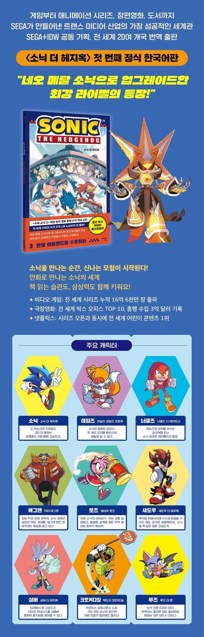 《소닉 더 헤지혹》 시리즈는 한발 더 나아가, 온 가족이 함께 모여 책을 읽고, 게임 속에서는 느끼지 못했던 소닉과 테일즈, 너클즈, 에이미의 스토리를 이야기하며, 소닉과 친구들이 펼치는 스피드 가득한 모험의 세계에 대해 대화하는 행복 가득한 경험을 아이들과 함께 나눌 수 있을 것이다.