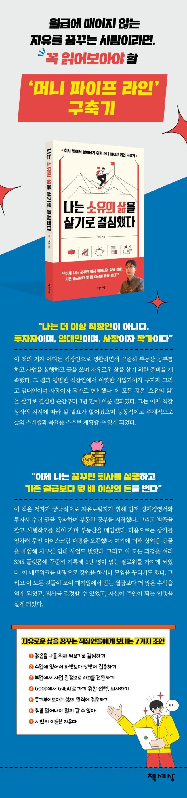 이 책은 저자가 궁극적으로 자유로워지기 위해 선택한 방법과 생각을 모은 것이다. 그리고 3년 동안 회사 밖에서 수입을 얻을 수 있는 머니 파이프 라인을 어떻게 구축할 수 있었는지를 구체적으로 밝히고 있다. 또한 소득이 높아지면서부터 변화하기 시작한 세상을 보는 관점과 인생을 대하는 자세를 진솔하게 드러내고 있다. 저자는 먼저 경제경영서와 투자서 수십 권을 독파하며 부동산 공부를 시작했다. 그리고 발품을 팔고 시행착오를 겪어 가며, 남들이 가는 길이 아닌 자신만의 경제적 안목과 투자 감각으로 부동산을 매입했다. 그리고 첫 번째 경험을 바탕으로 연이어 두 번째 부동산도 매입하게 되었다. 다음으로는 상가를 임차해 무인 아이스크림 매장을 오픈했다. 이 역시 추운 겨울에 주변 소비 시장을 점검하고 임장을 해서 결정한 투자였다. 이 매장은 손수 인테리어를 하고 매장 오픈 준비를 하고 홍보 활동을 벌여 연 매출 1억 원을 달성하기에 이르렀다. 여기에 더해 상업용 건물을 매입해 사무실 임대 사업도 벌였다. 그리고 이 모든 과정을 여러 SNS 플랫폼에 꾸준히 기록해 1만 명이 넘는 팔로워를 가지게 되었다. 이 네트워크를 바탕으로 강연을 하거나 모임을 꾸리기도 했다. 그리고 이 모든 것들이 모여 대기업에서 받는 월급보다 더 많은 수익을 얻게 되었고, 퇴사를 결정할 수 있었고, 자신이 주인이 되는 인생을 살게 되었다.